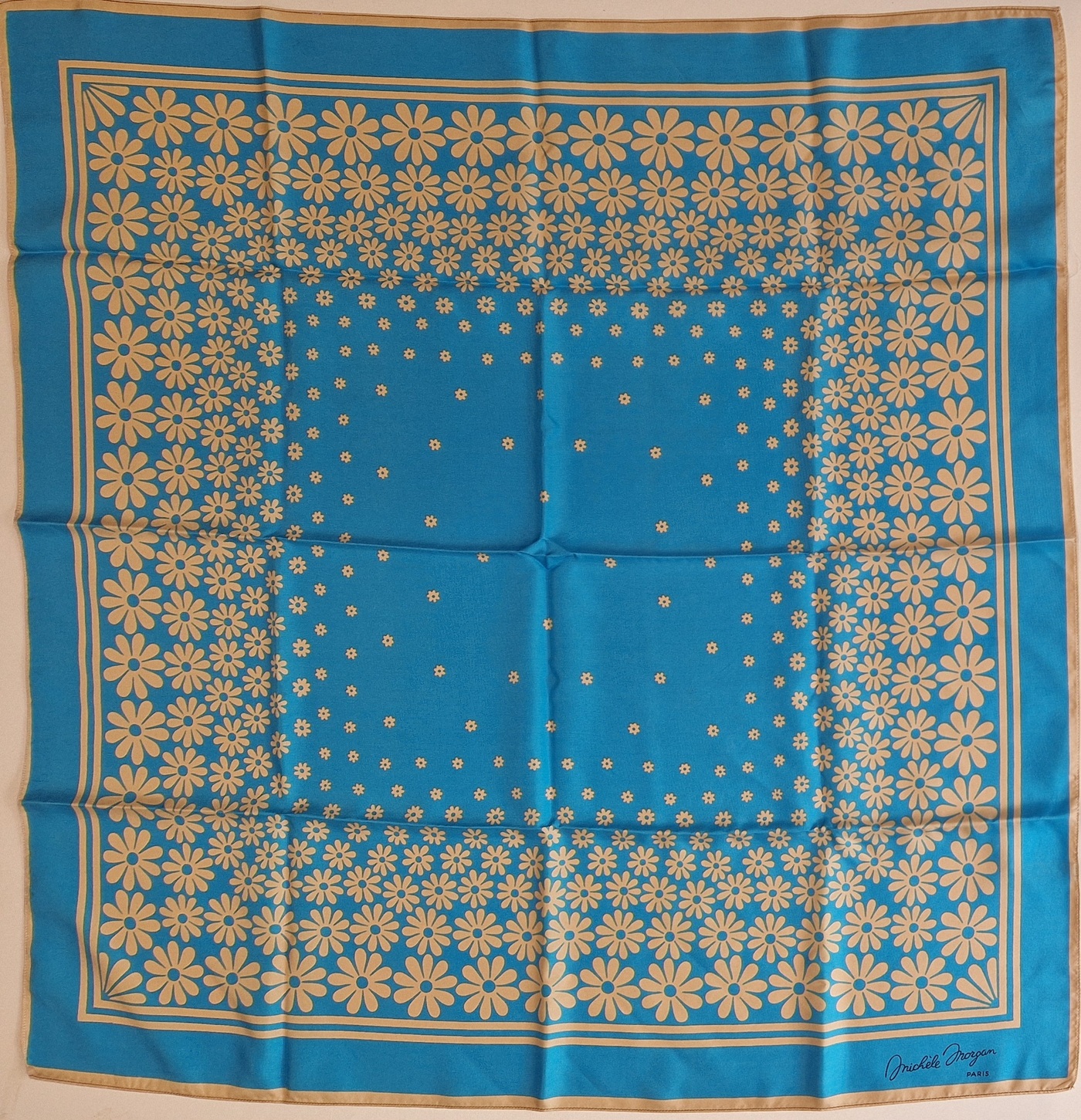 Voici un ravissant carré vintage en soie griffé Michèle Morgan Paris