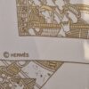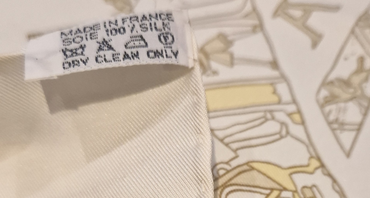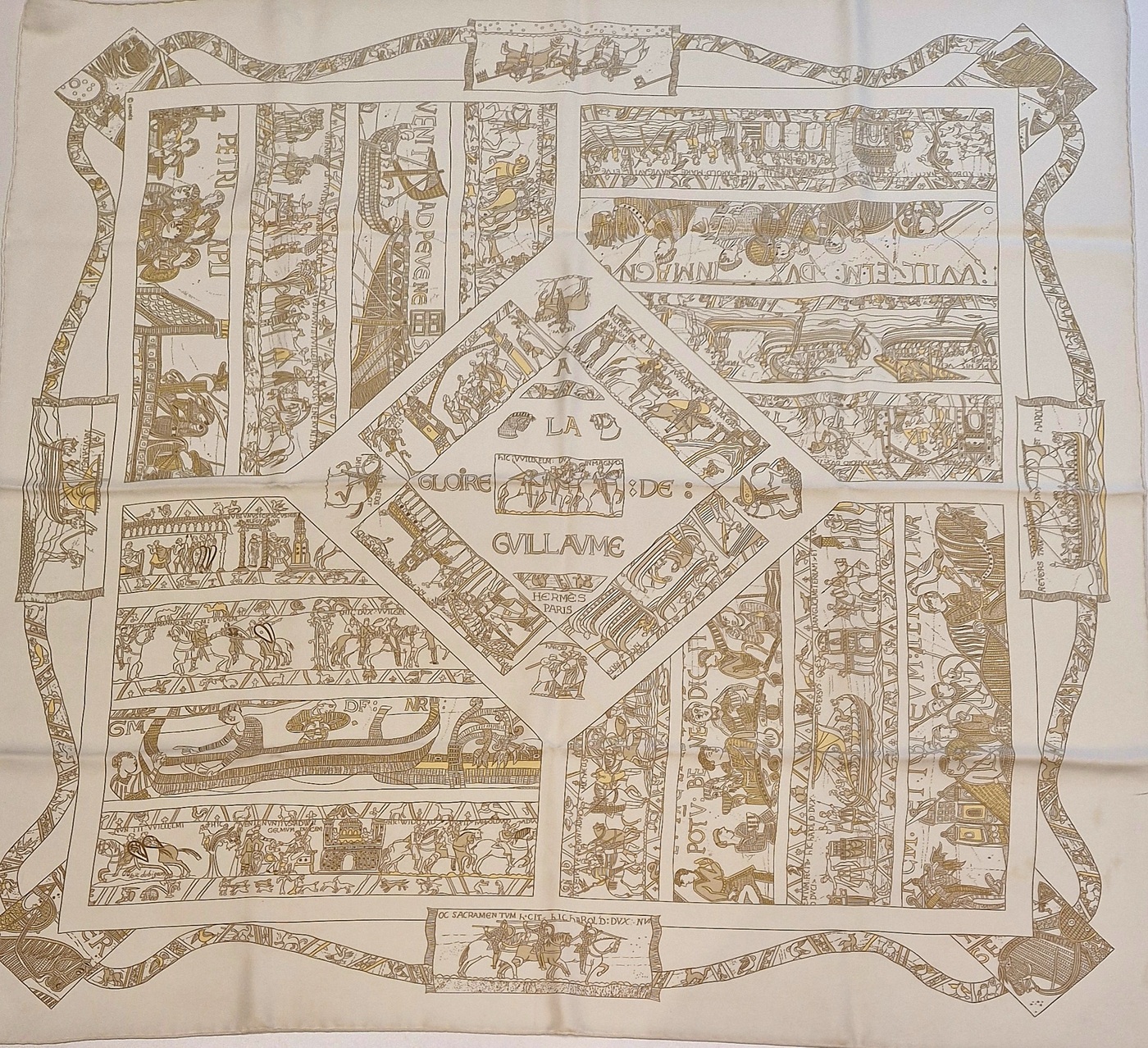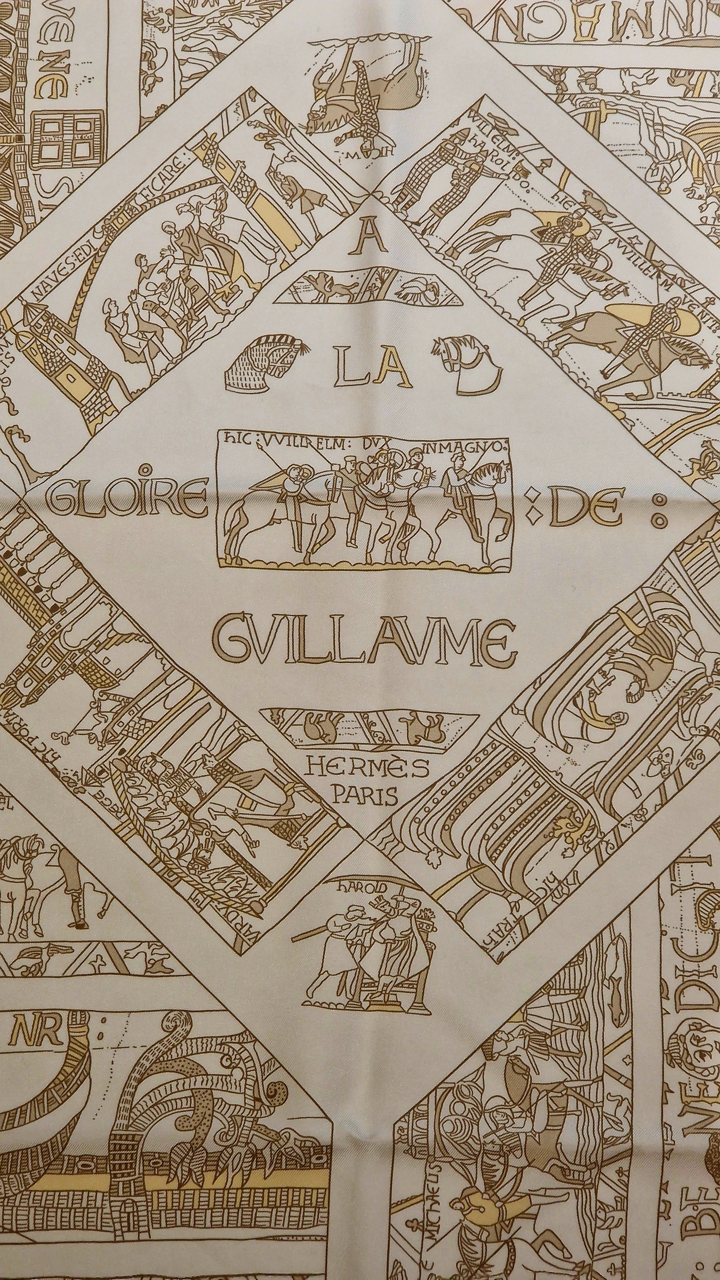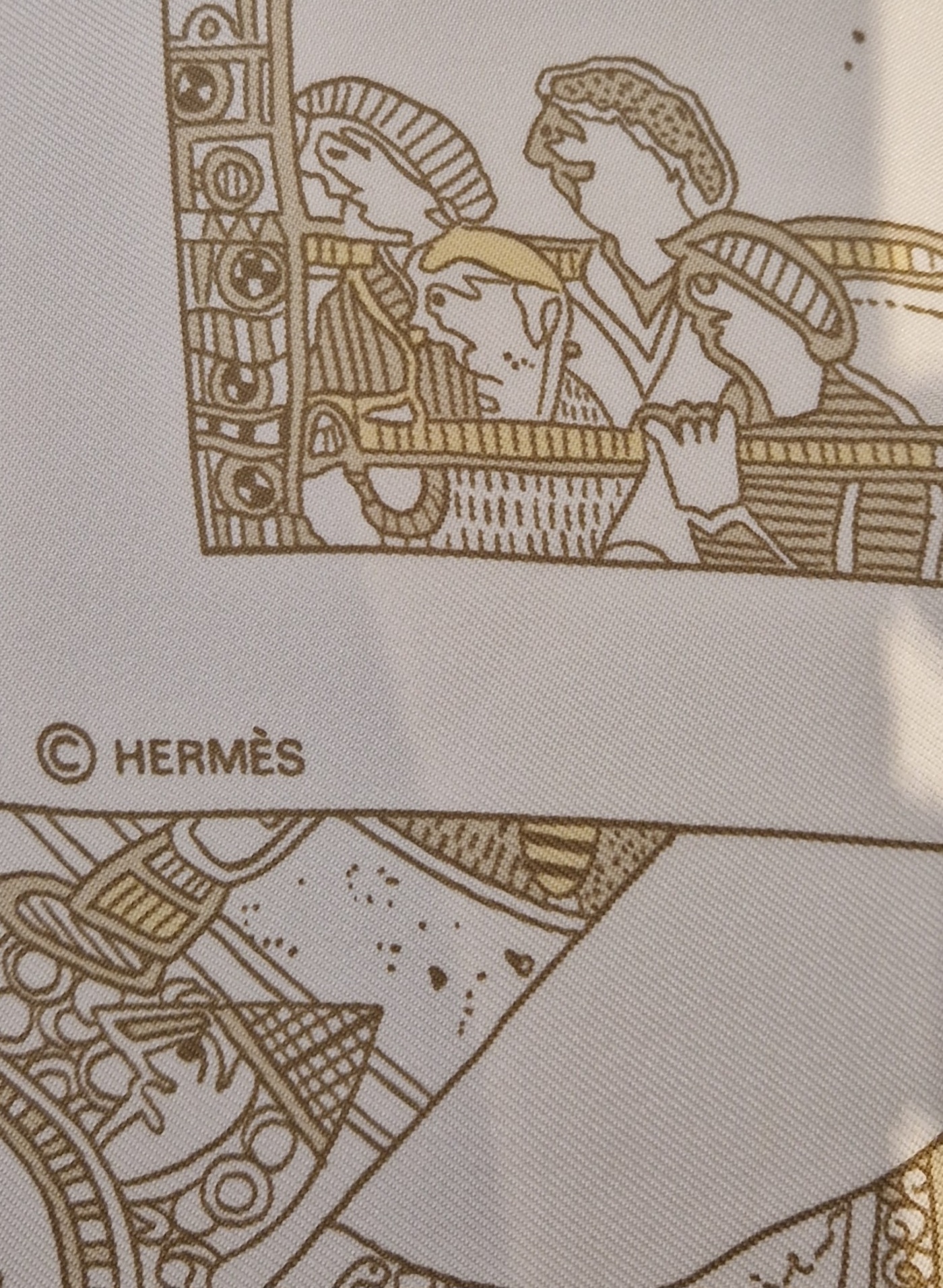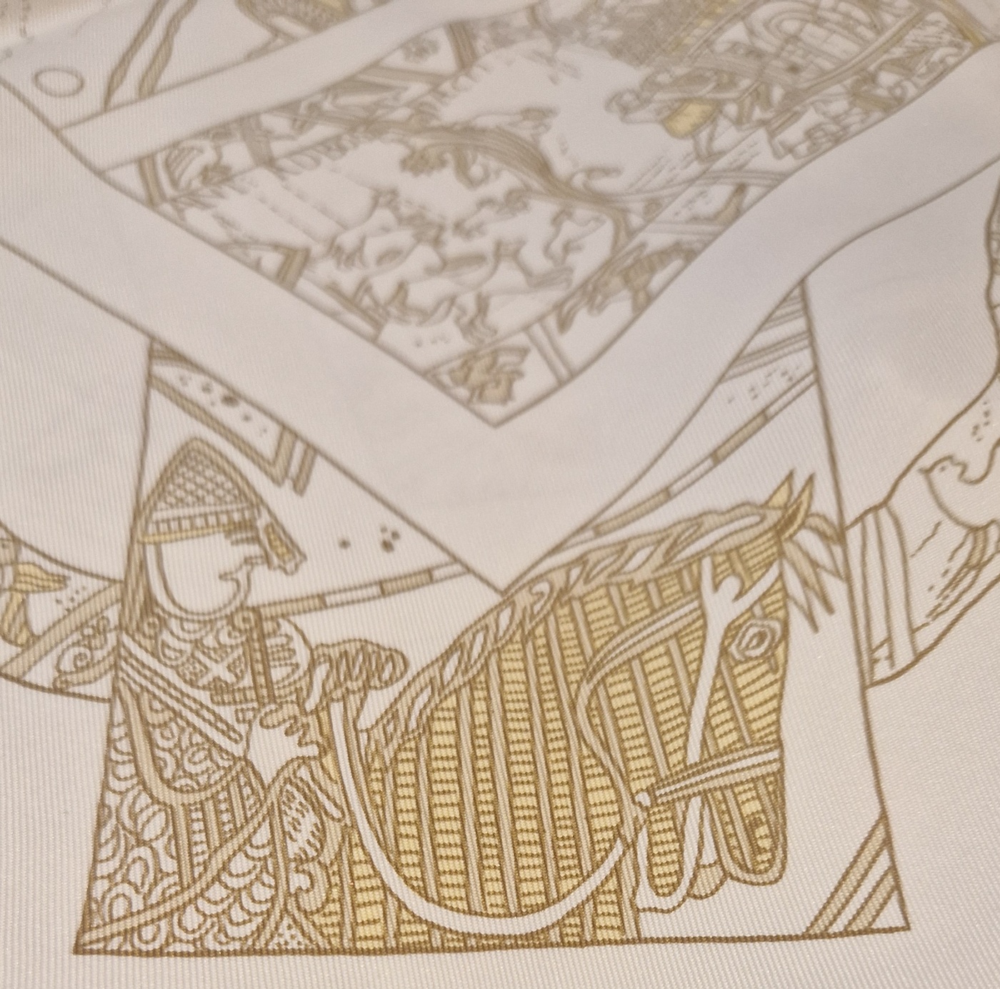 This understated and refined version, in off-white and light gold hues, showcases the exquisite detail of the design and the graphic mastery of Dubigeon, one of the most emblematic artists of the House of Hermès in the 1990s. Born in Brittany, he created numerous scarves featuring Normandy.