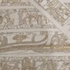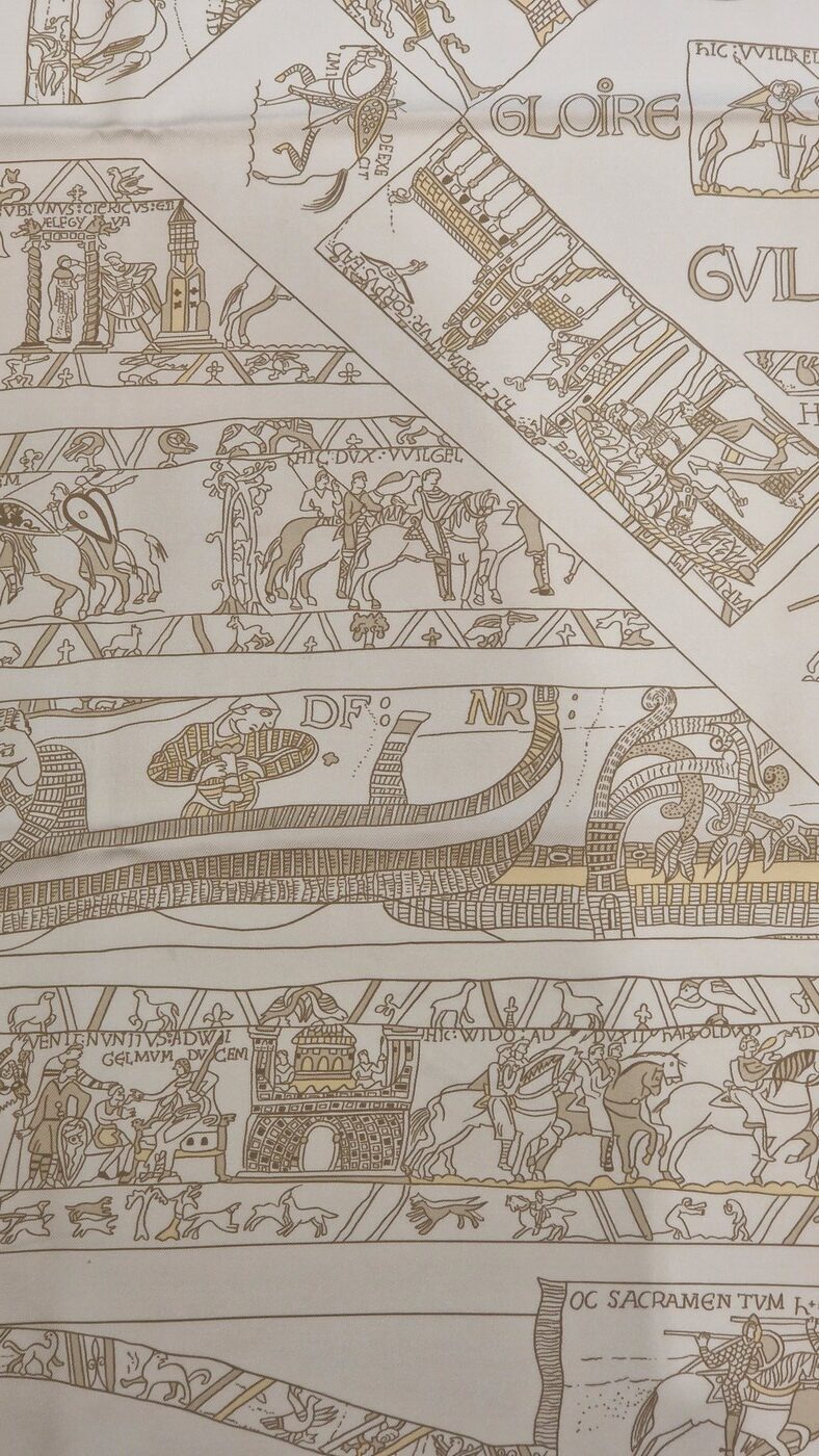The meticulous friezes recall the medieval style of the original work, with horsemen, ships, and battle scenes depicted in gold outlines on an ivory background.