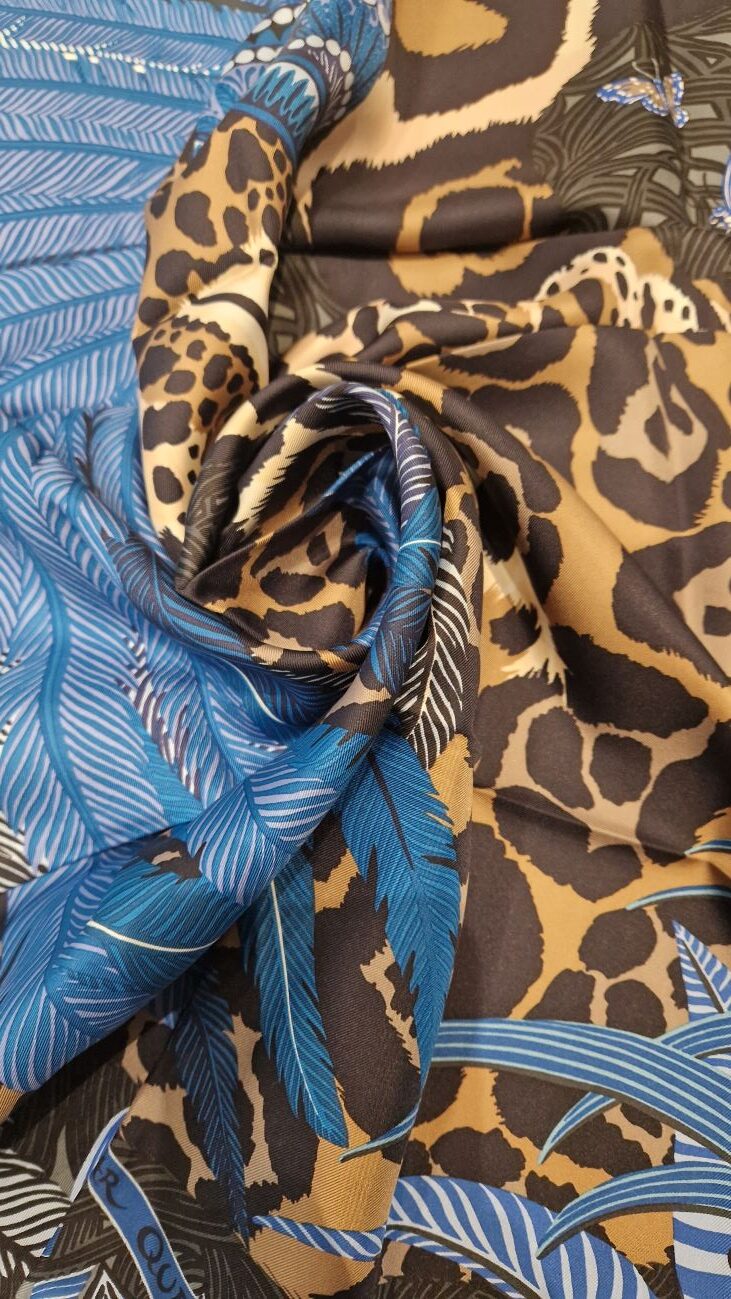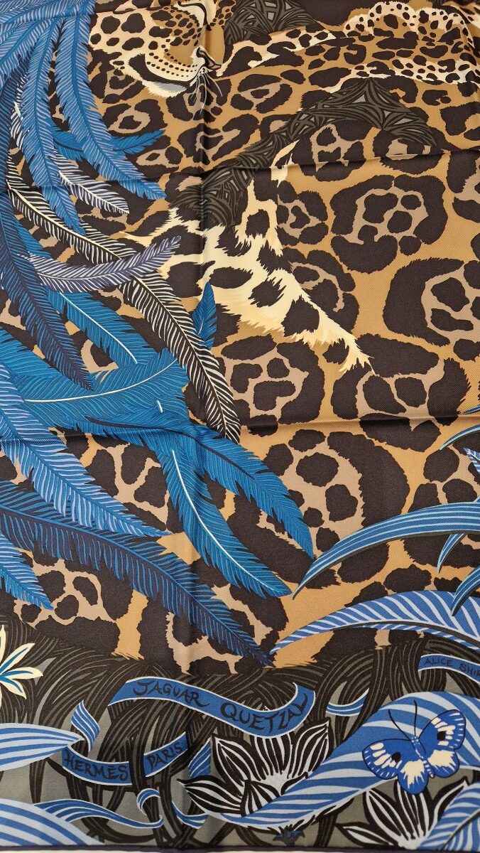 Ce carré Hermès Jaguar Quetzal  a été dessiné par  Alice Shirley et  a été publié dans  la collection printemps été 2018