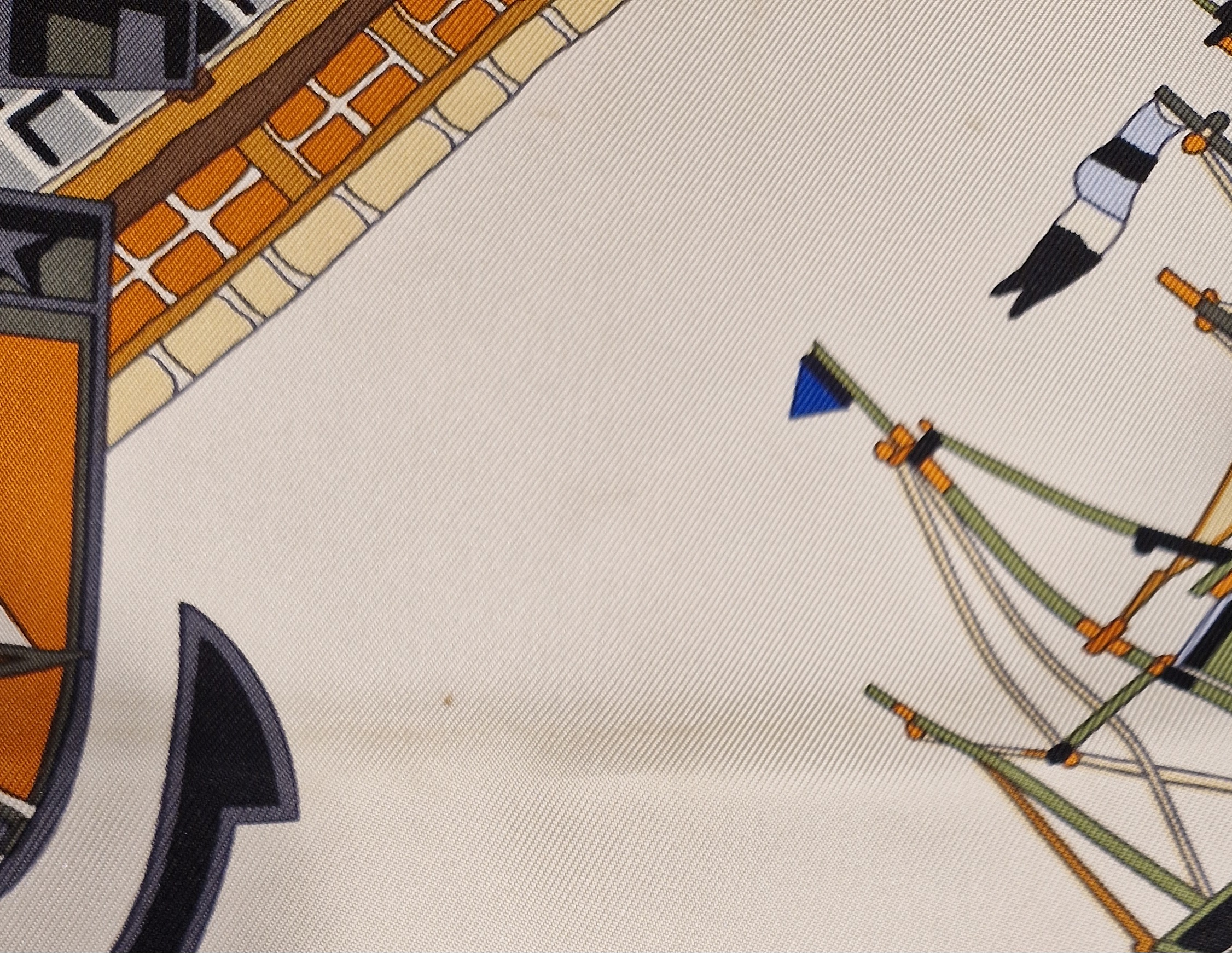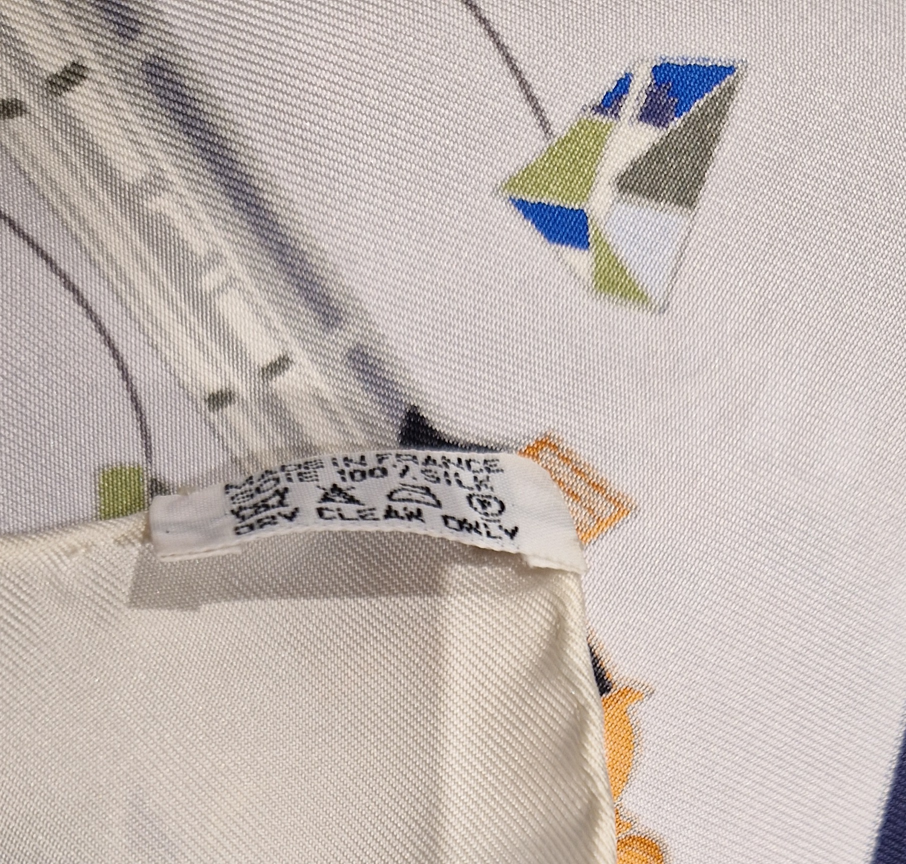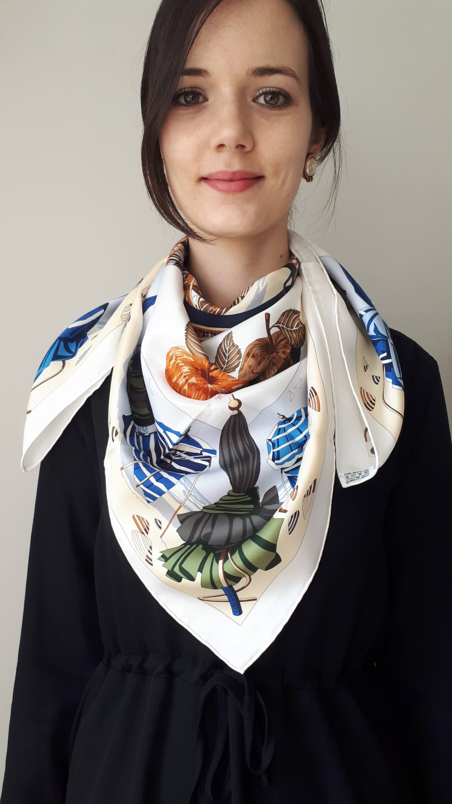 Lovely in its superb colors against a white background, this scarf is in excellent condition, having been worn very little. I should point out, however, a slight gray line that did not disappear after dry cleaning (see the last photo). It is due to improper storage of the scarf folded.