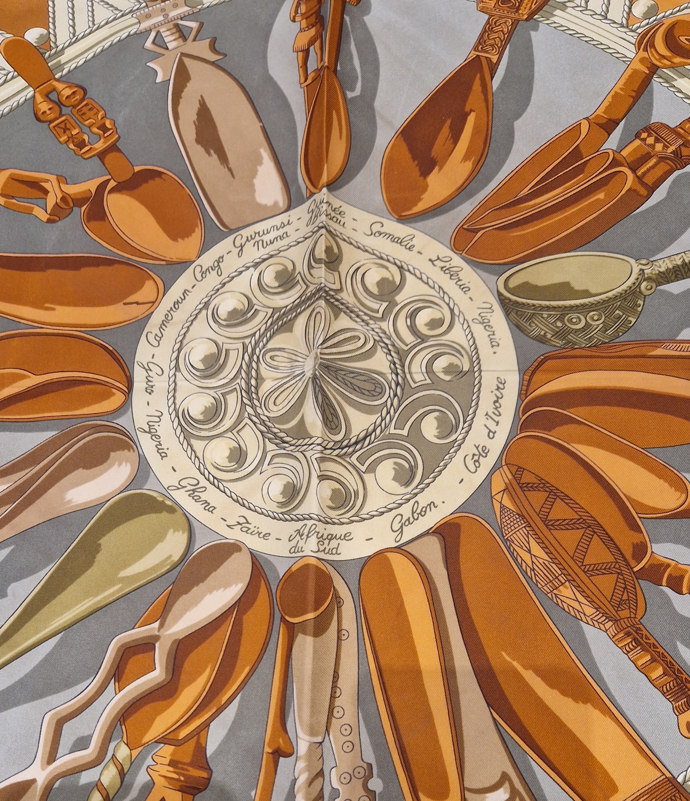 Ce carré Hermès Cuillers d’Afrique a été dessiné  par Cathy Latham et édité en 1997