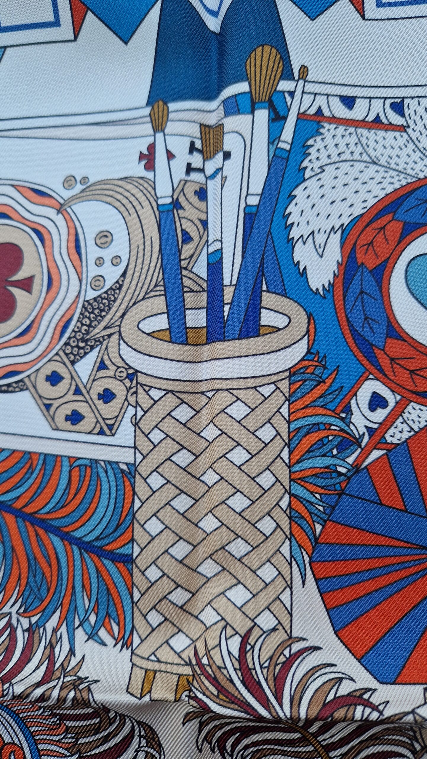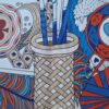 Végétations délicates, cartes à jouer, mosaïques et géométries multiples se superposent, créant ainsi différents registres jusqu’à former un extravagant assemblage.