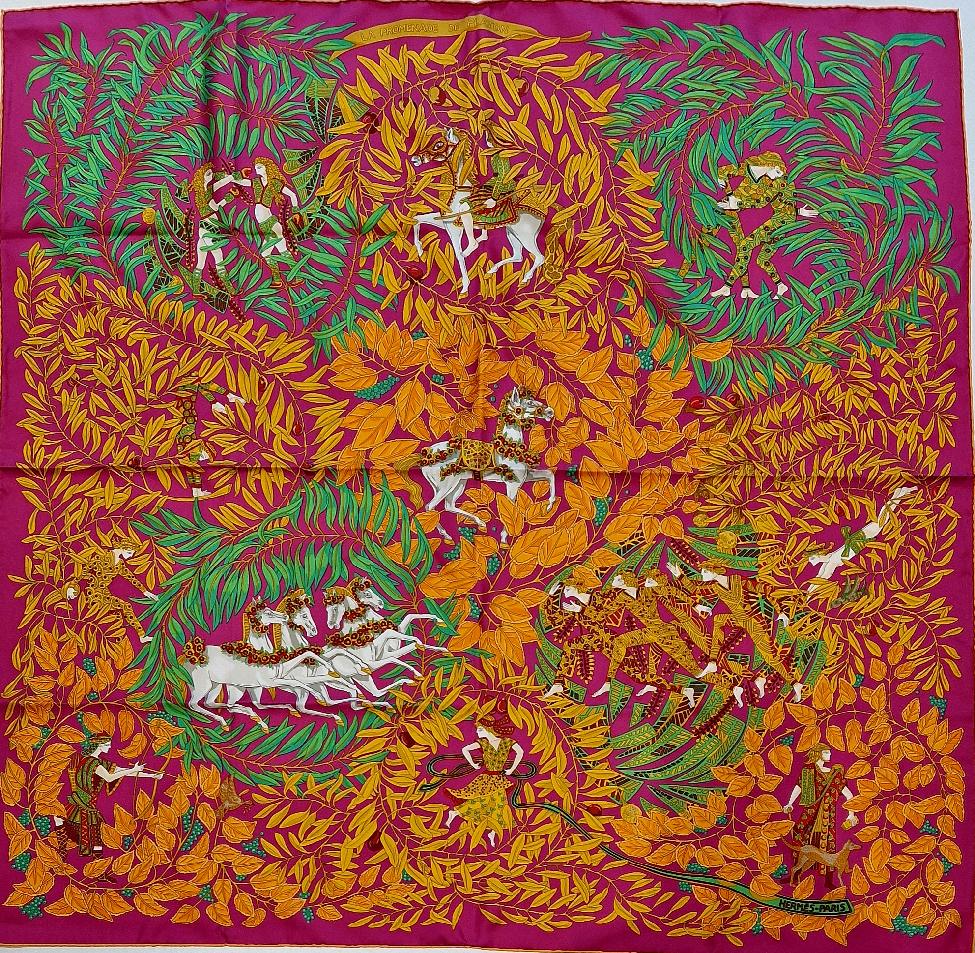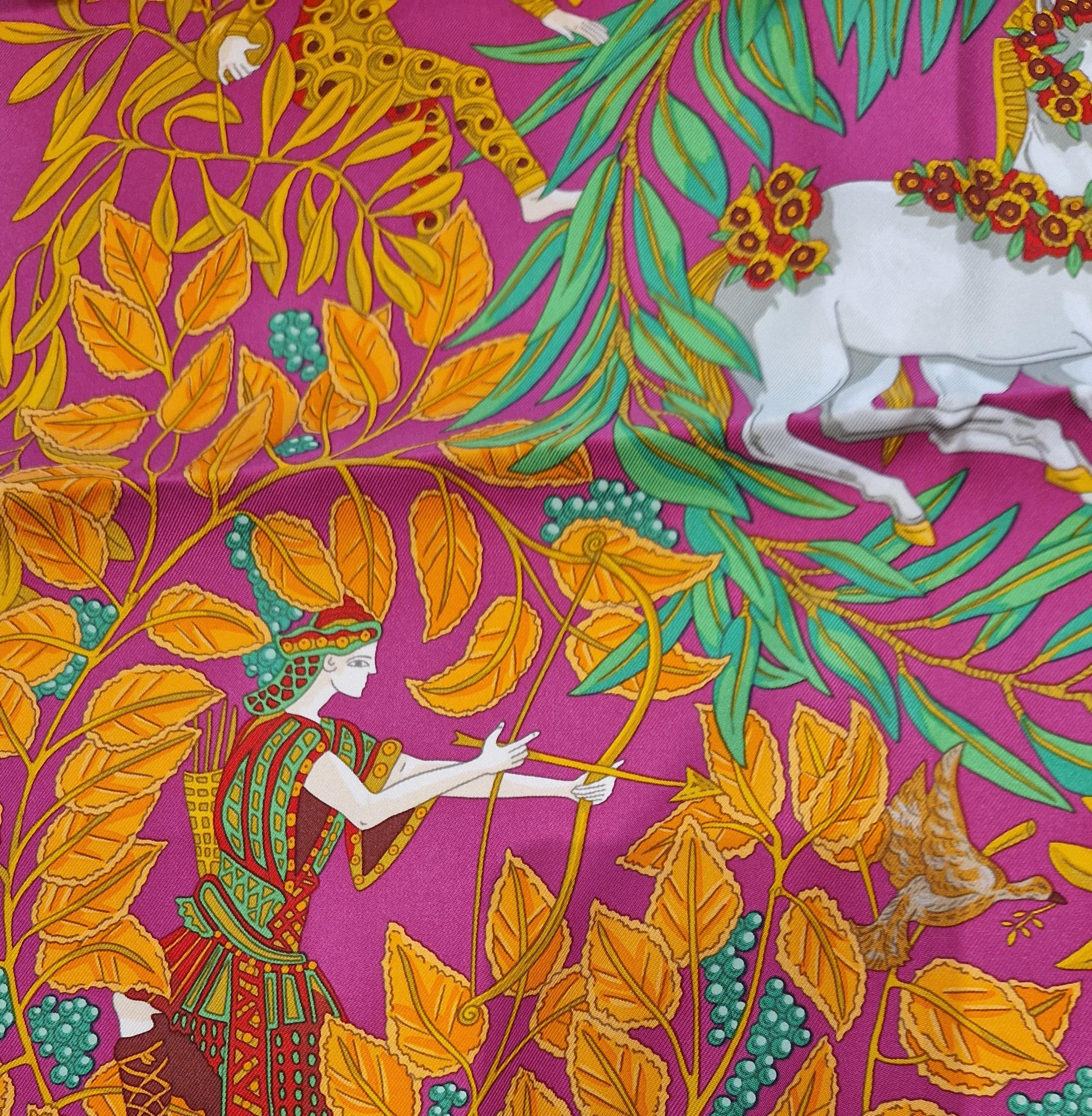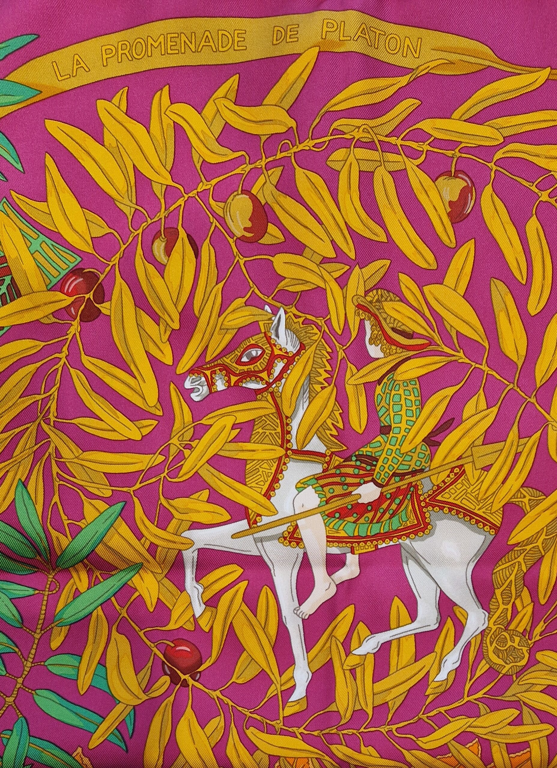 Ce carré Hermès La promenade de Platon dessiné par Annie Faivre et publié en 2013 est magnifique dans ces coloris fushia et orange.