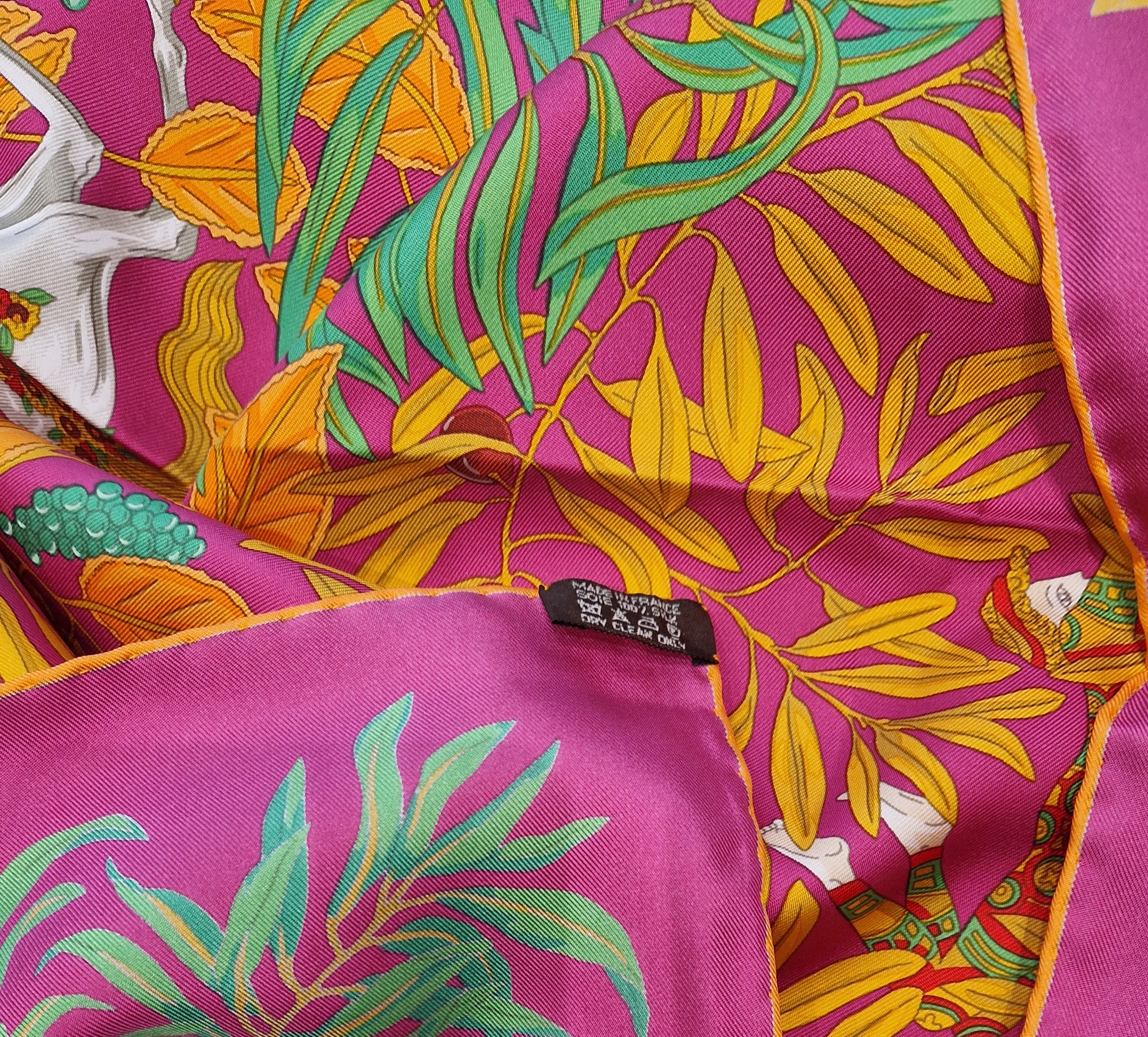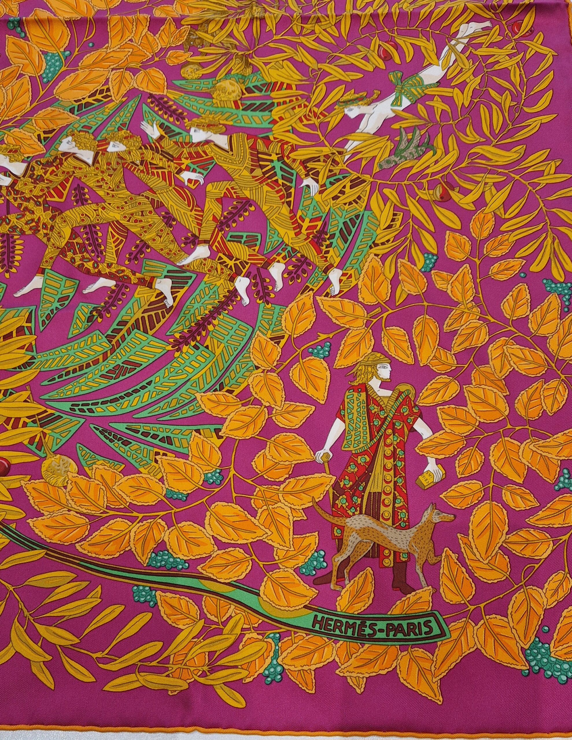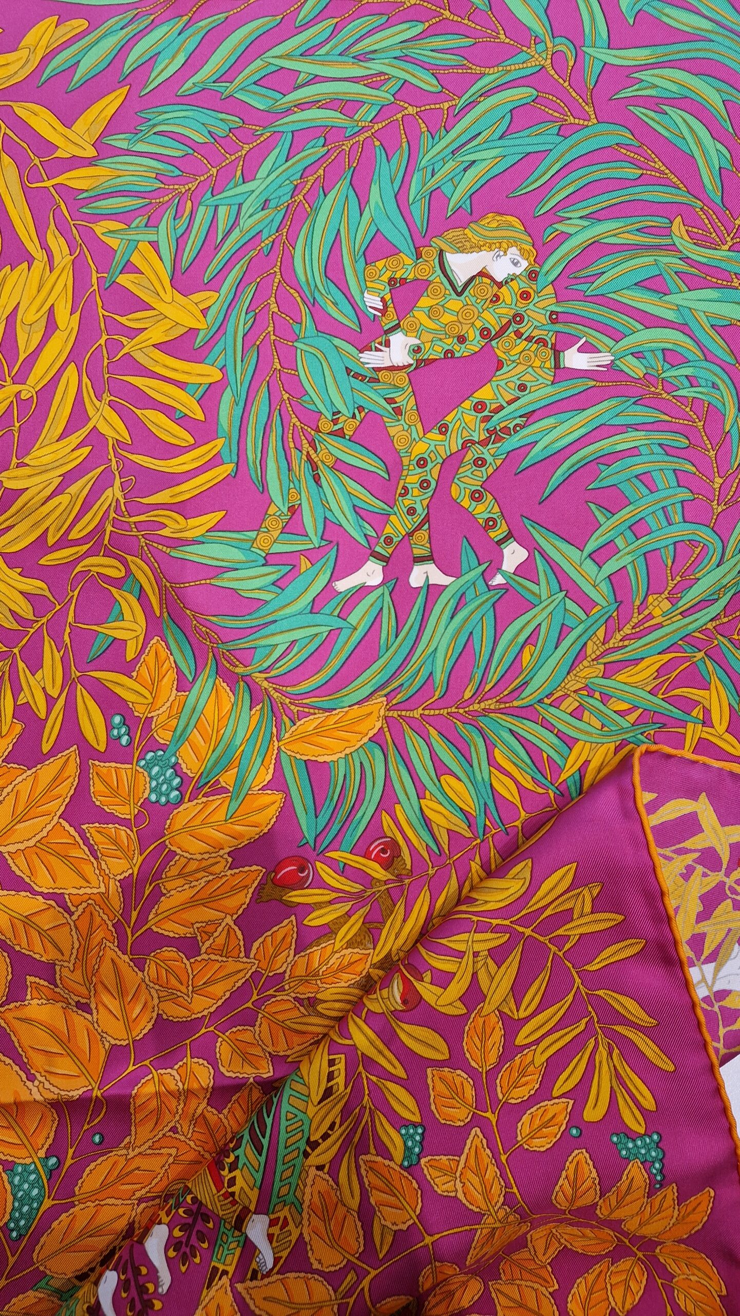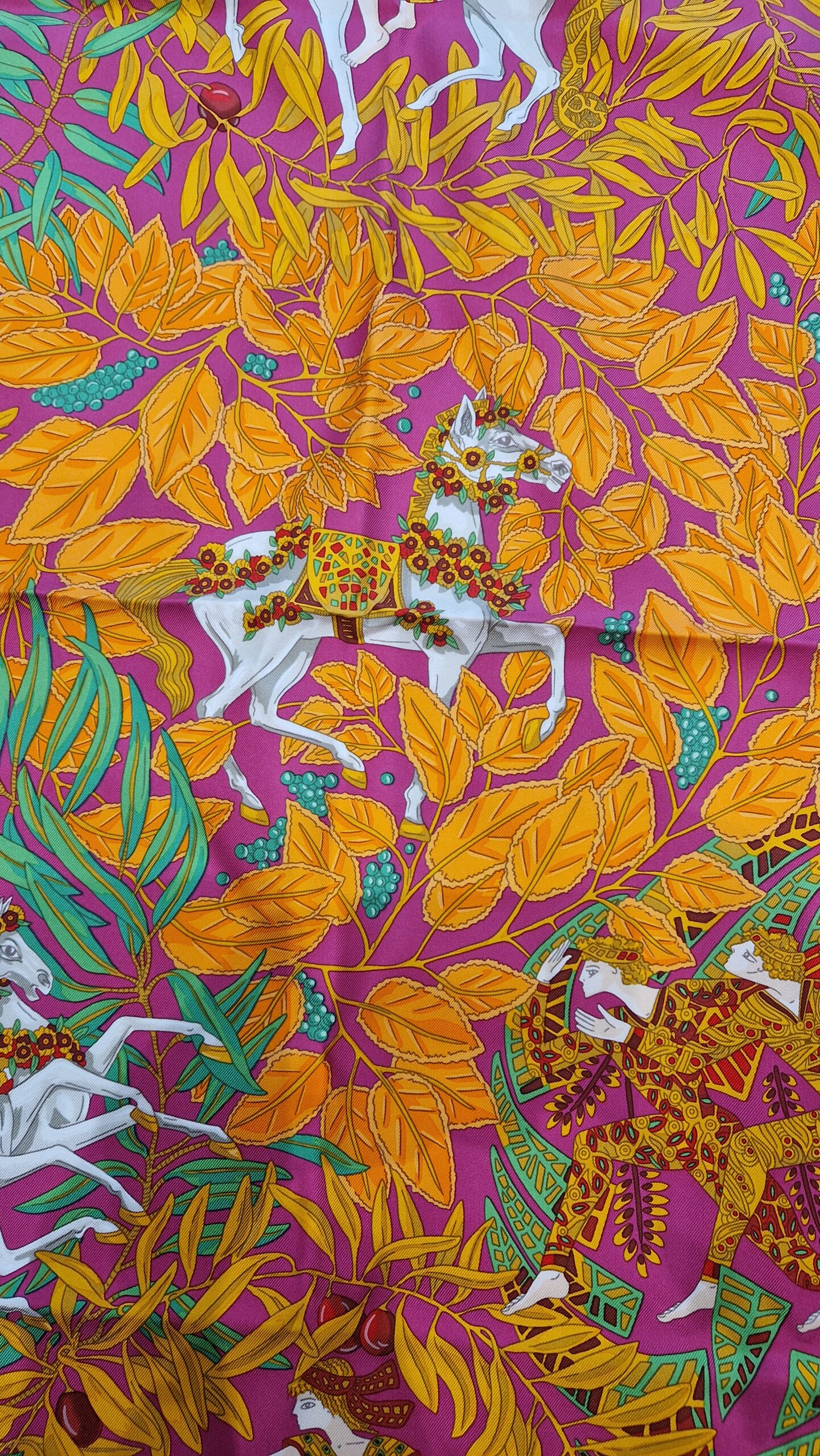 Ce carré Hermès La promenade de Platon dessiné par Annie Faivre et publié en 2013 est magnifique dans ces coloris fushia et orange.