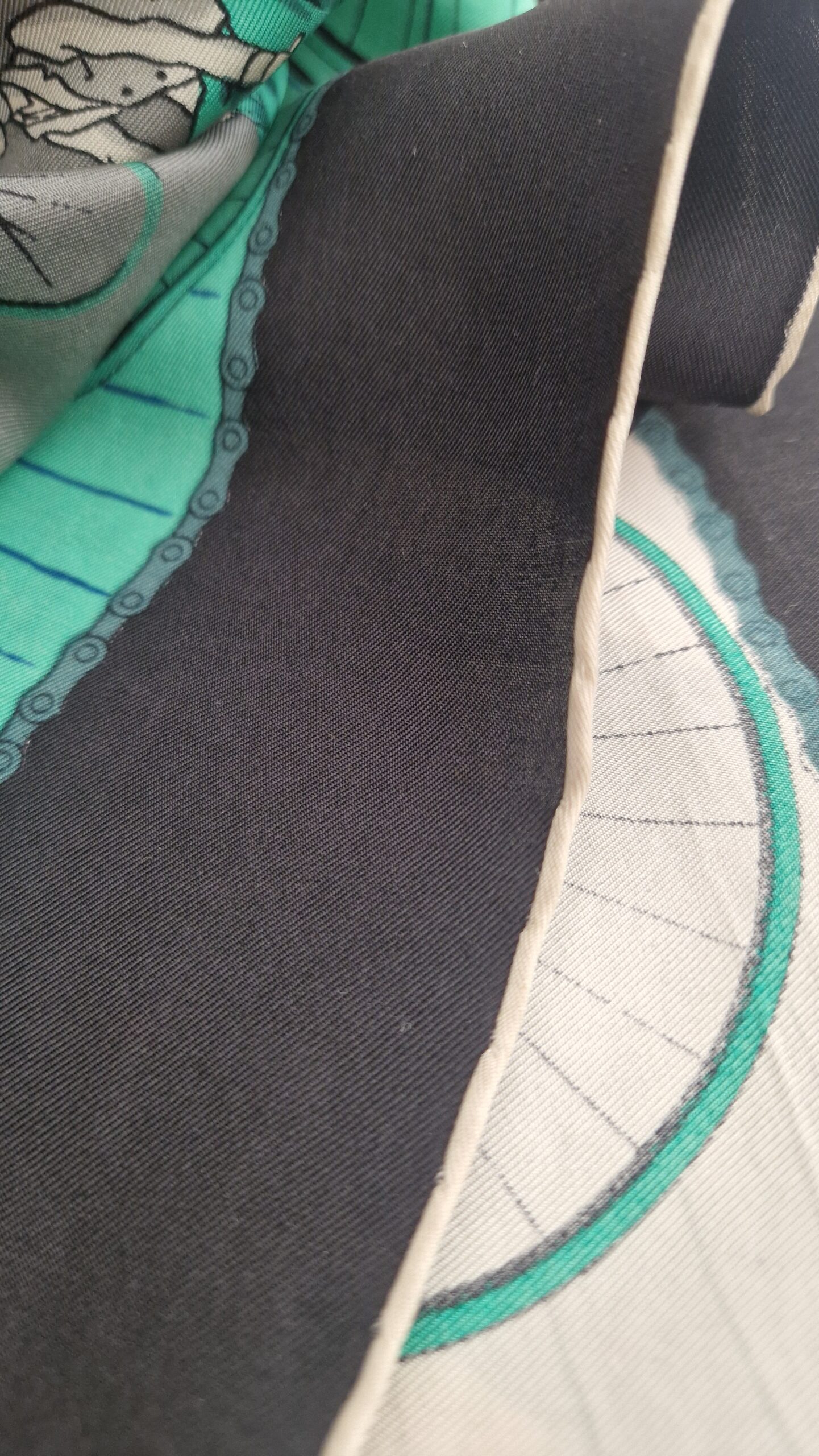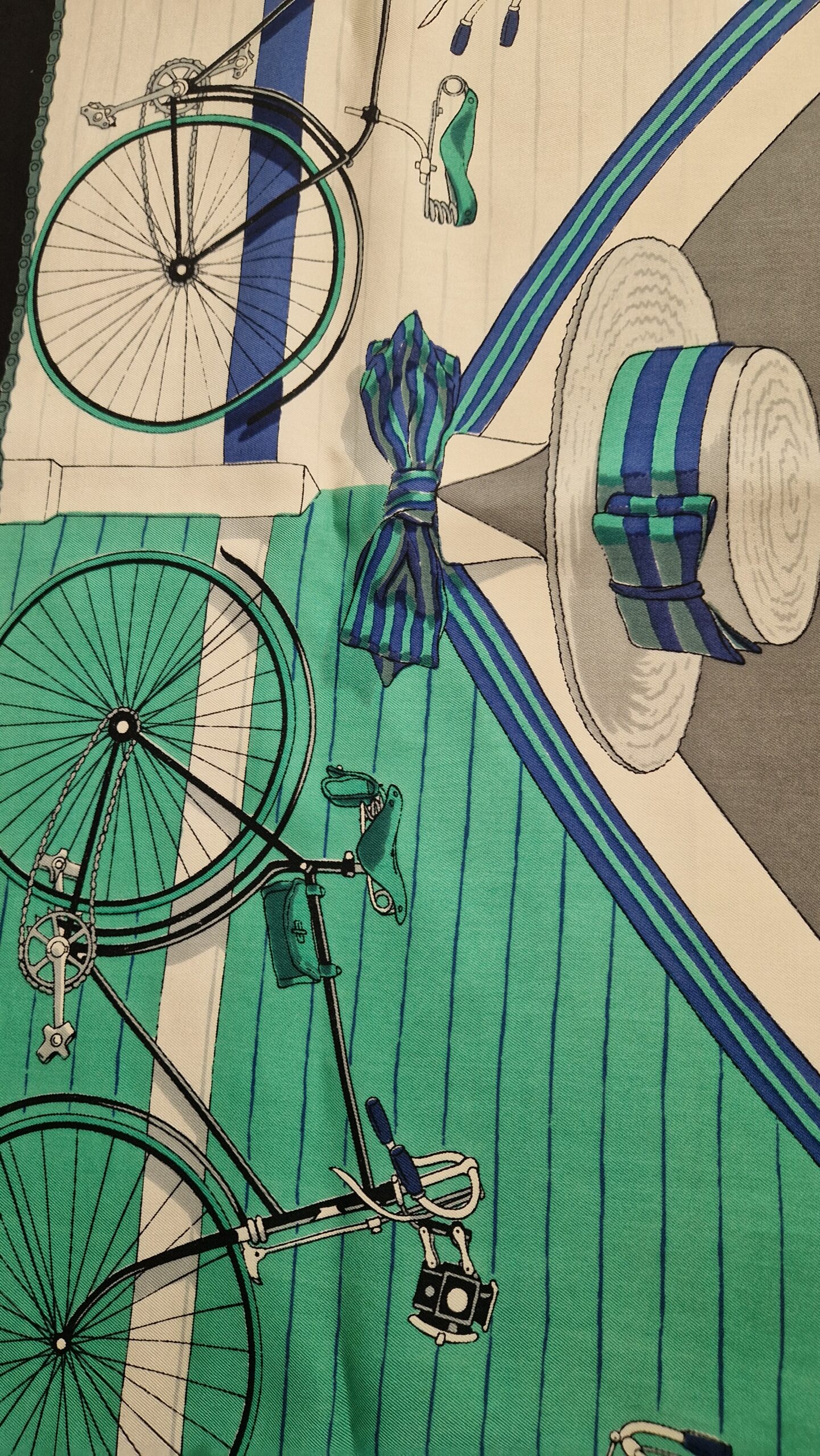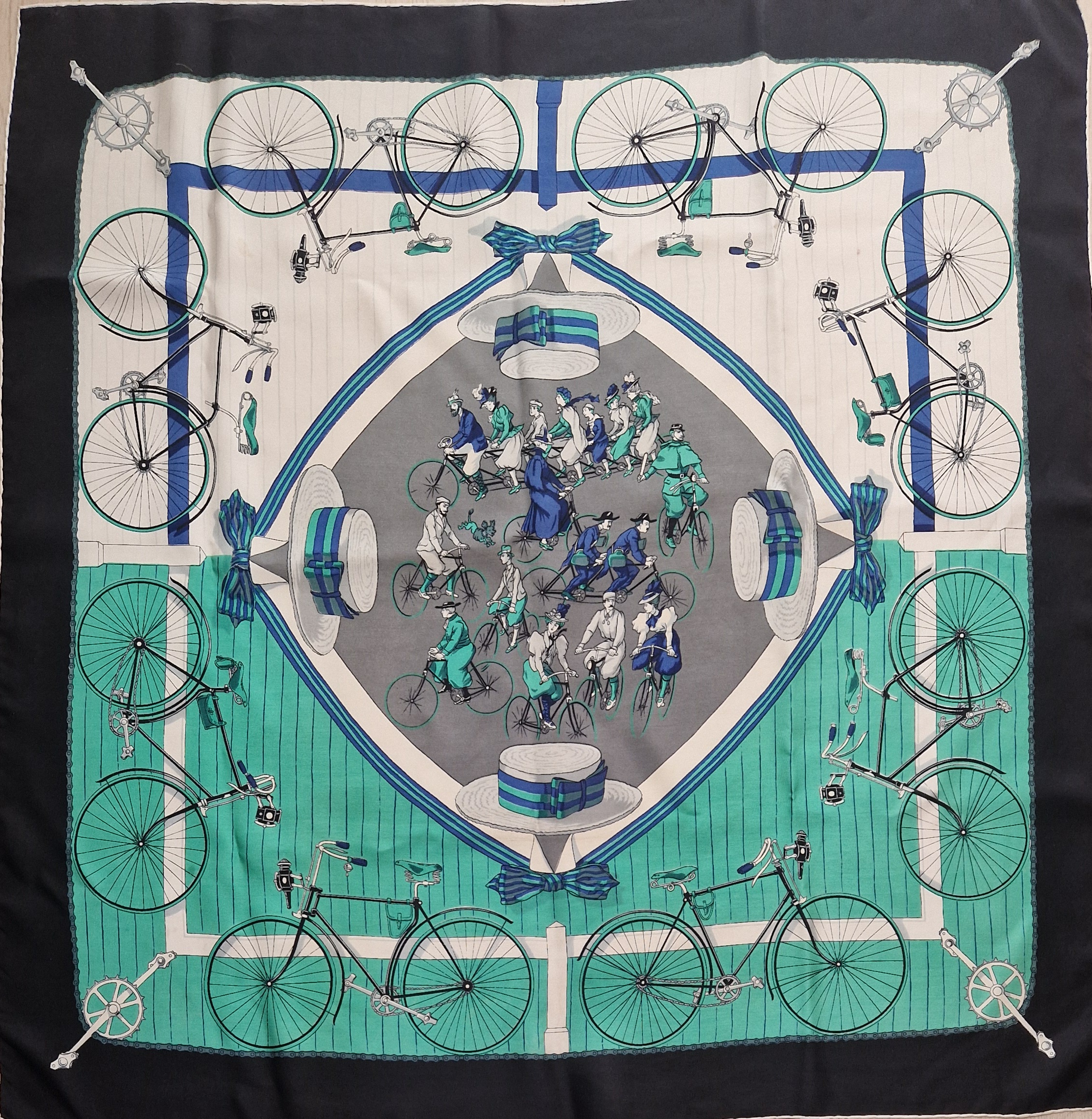 Ce carré Hermès titré Cycles  a été dessiné par Hugo Grykar en 1953, il a été ensuité réédité en 1974  et titré  Les bécanes .