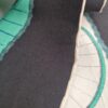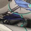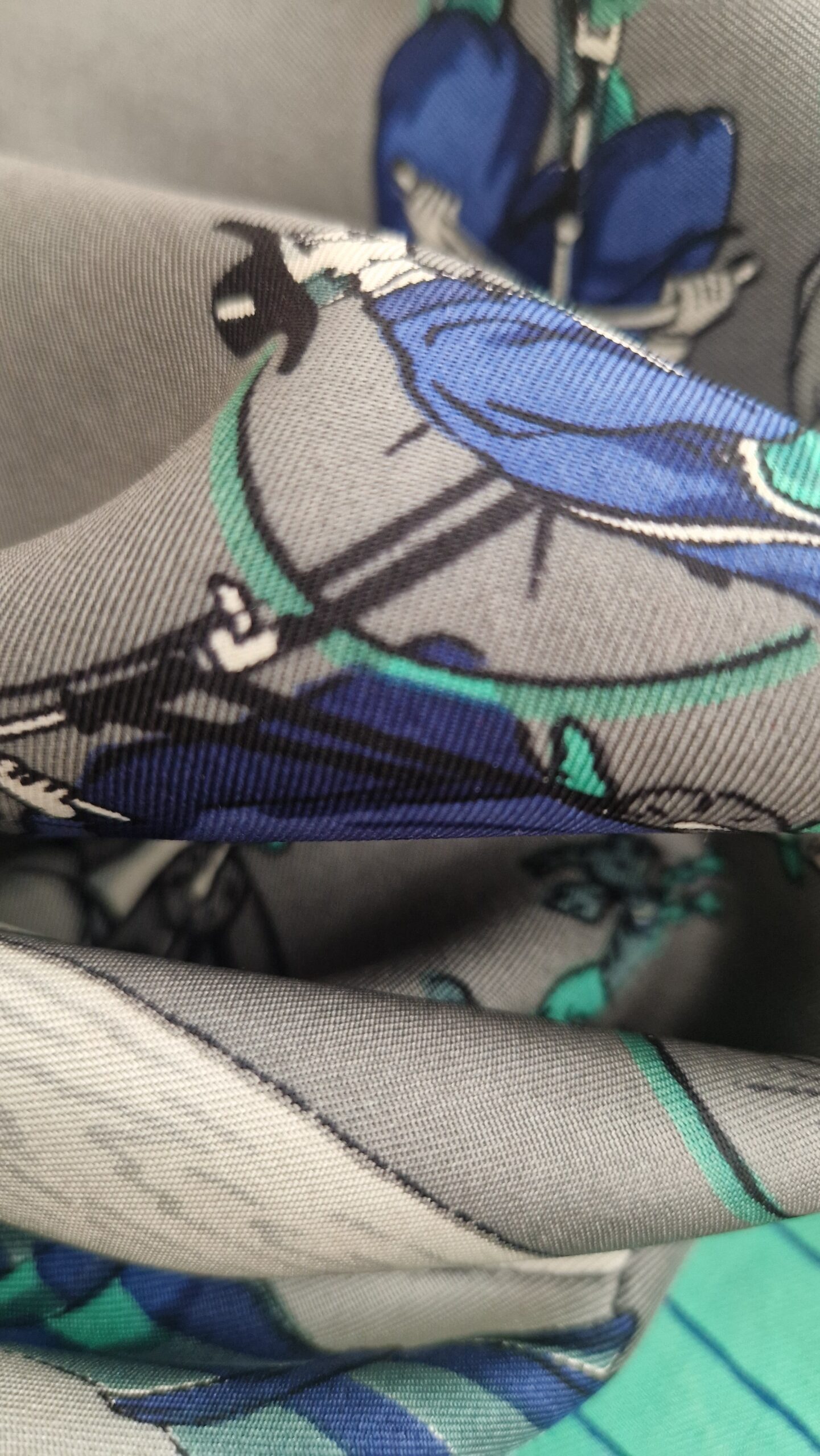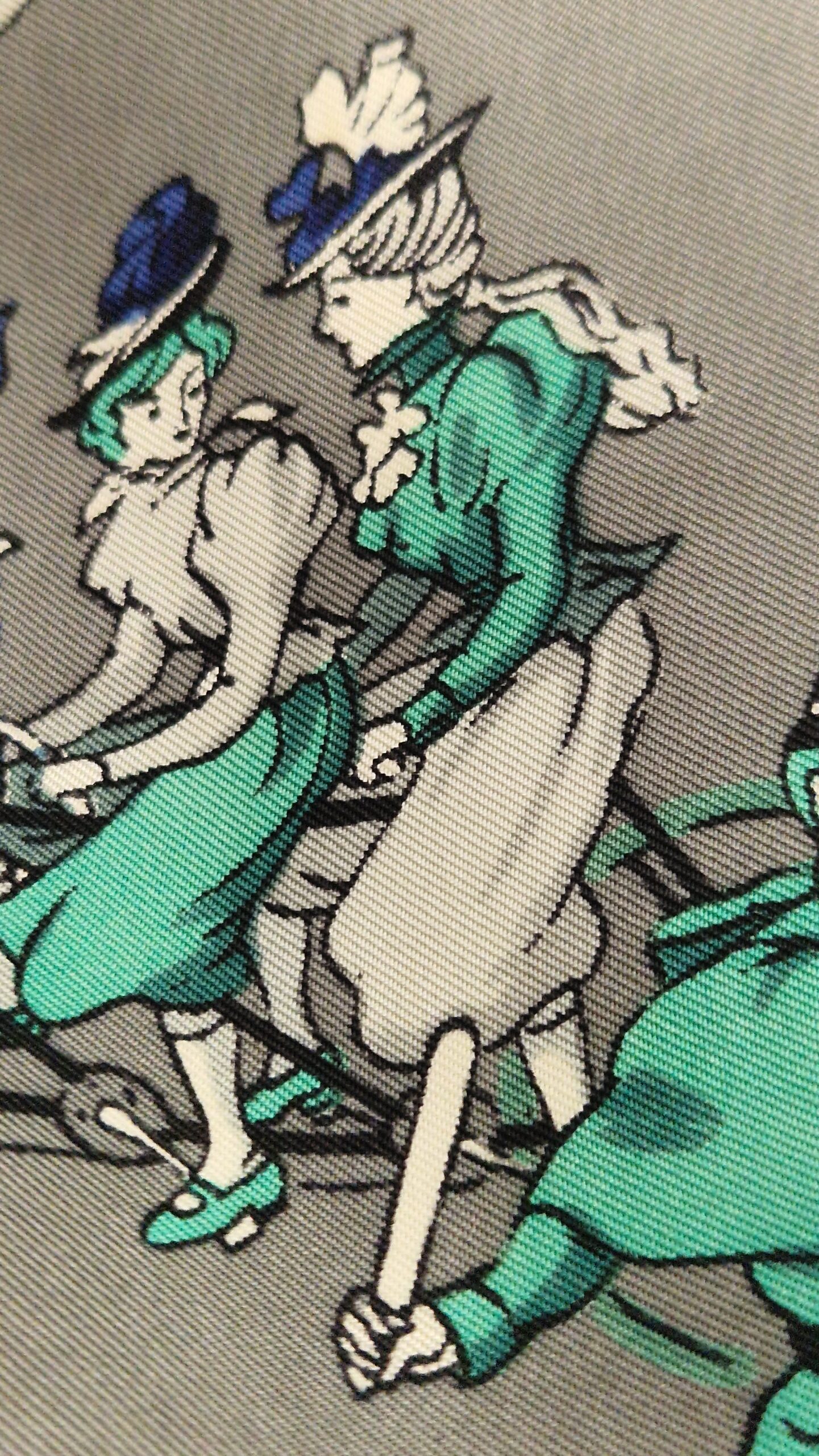 Coloris : bord noir, motifs gris, bleu et  vert sur un fond gris ou blanc