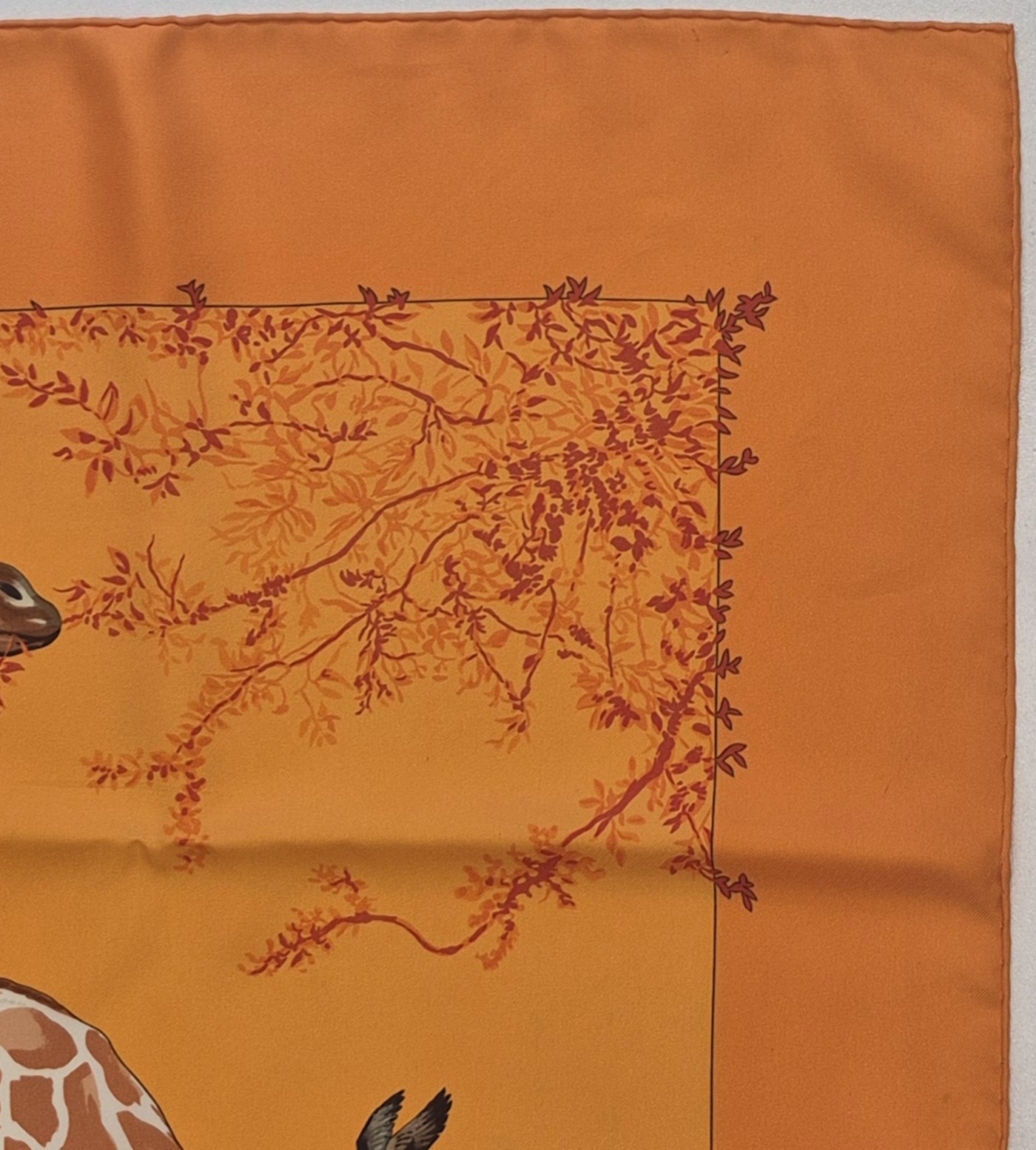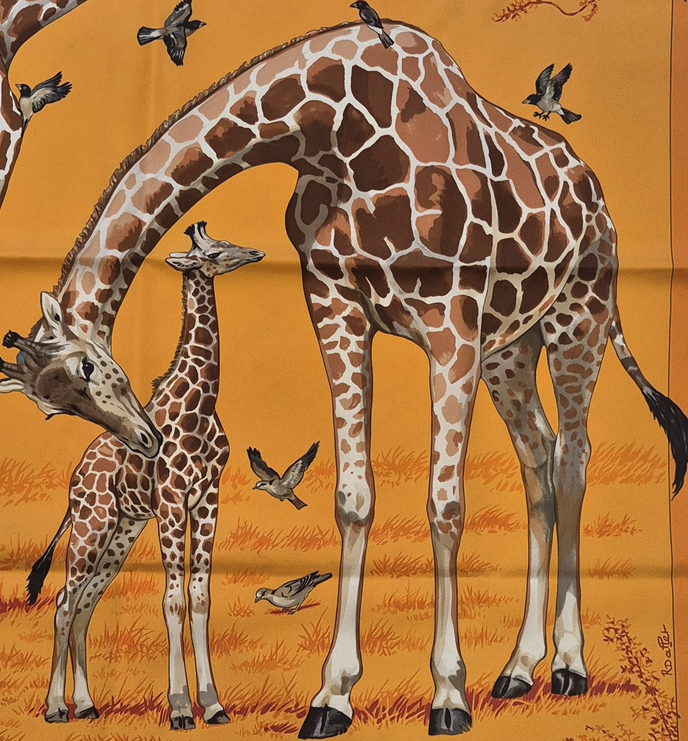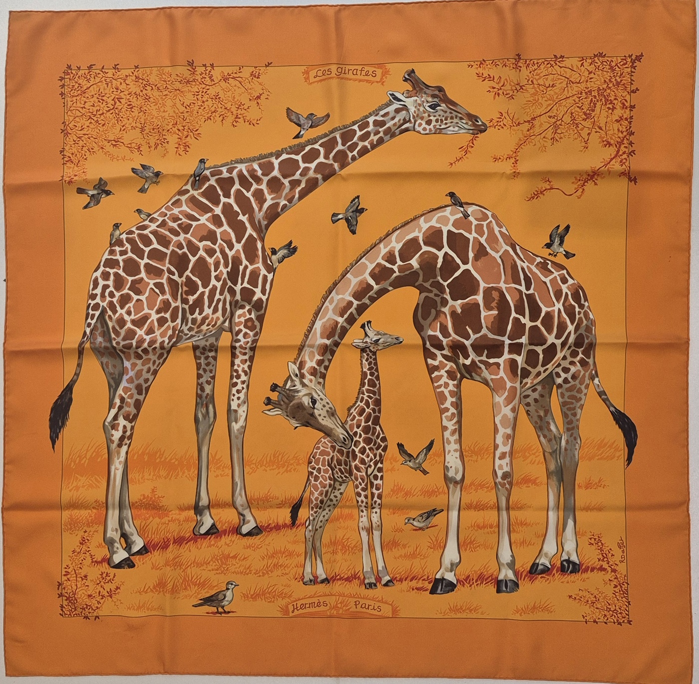 Beautiful Hermès silk carré designed by Robert Dallet, published in 2006. This tender and lifelike composition features a giraffe family surrounded by birds, rendered with the naturalist precision and warmth that define Dallet’s work.