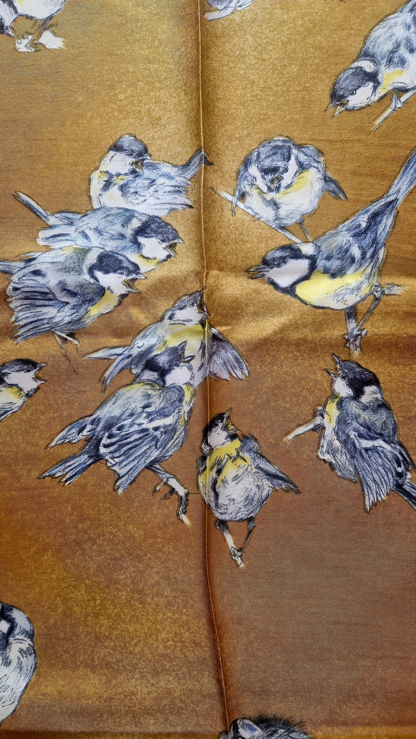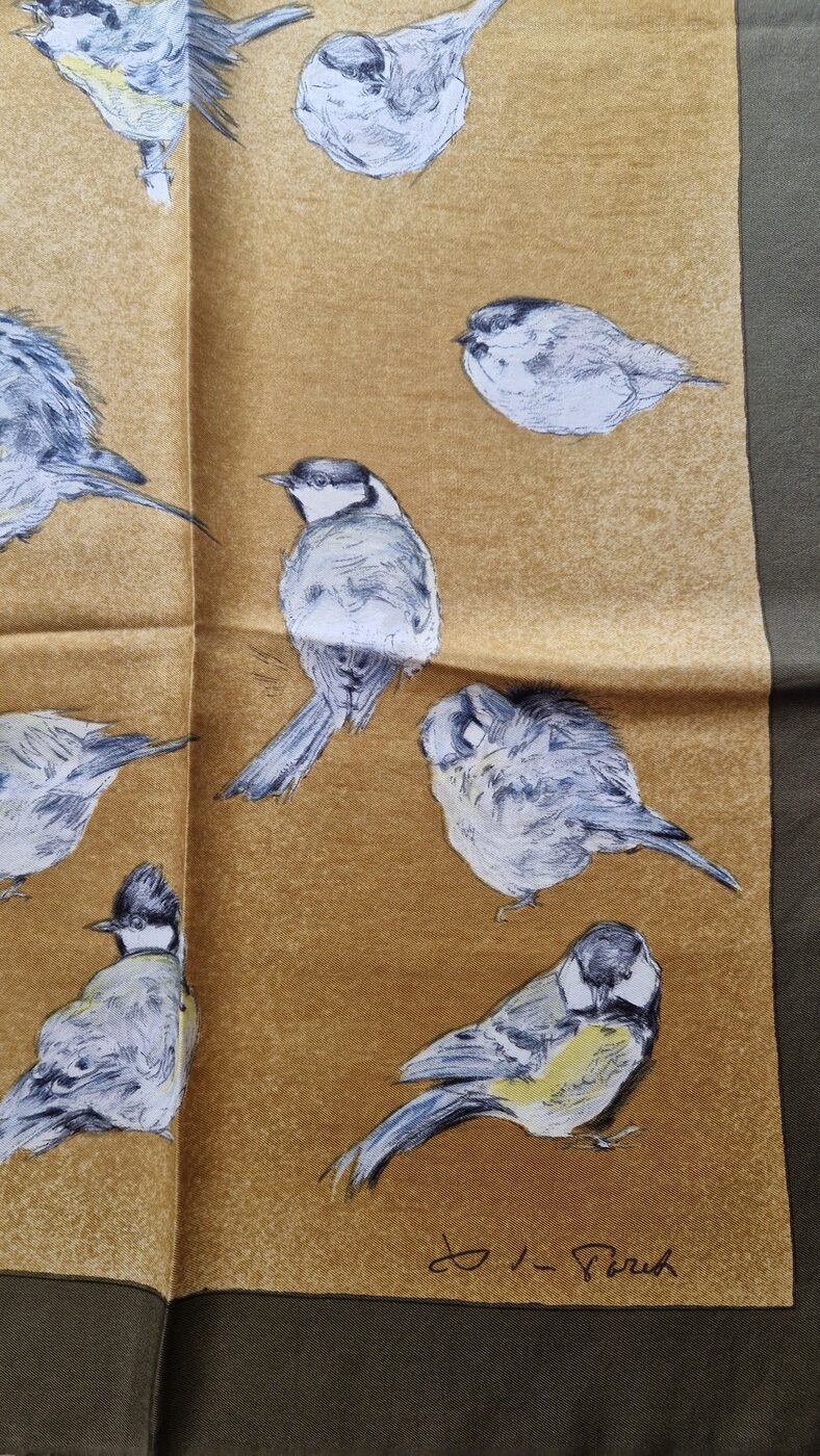 Chaque oiseau est dessiné avec un réalisme saisissant et une sensibilité propre au style unique de Poret. Le contraste entre les nuances de gris bleuté, jaune pâle et noir, et le fond moutarde doré bordé de vert olive, confère à ce carré une élégance naturelle et intemporelle.