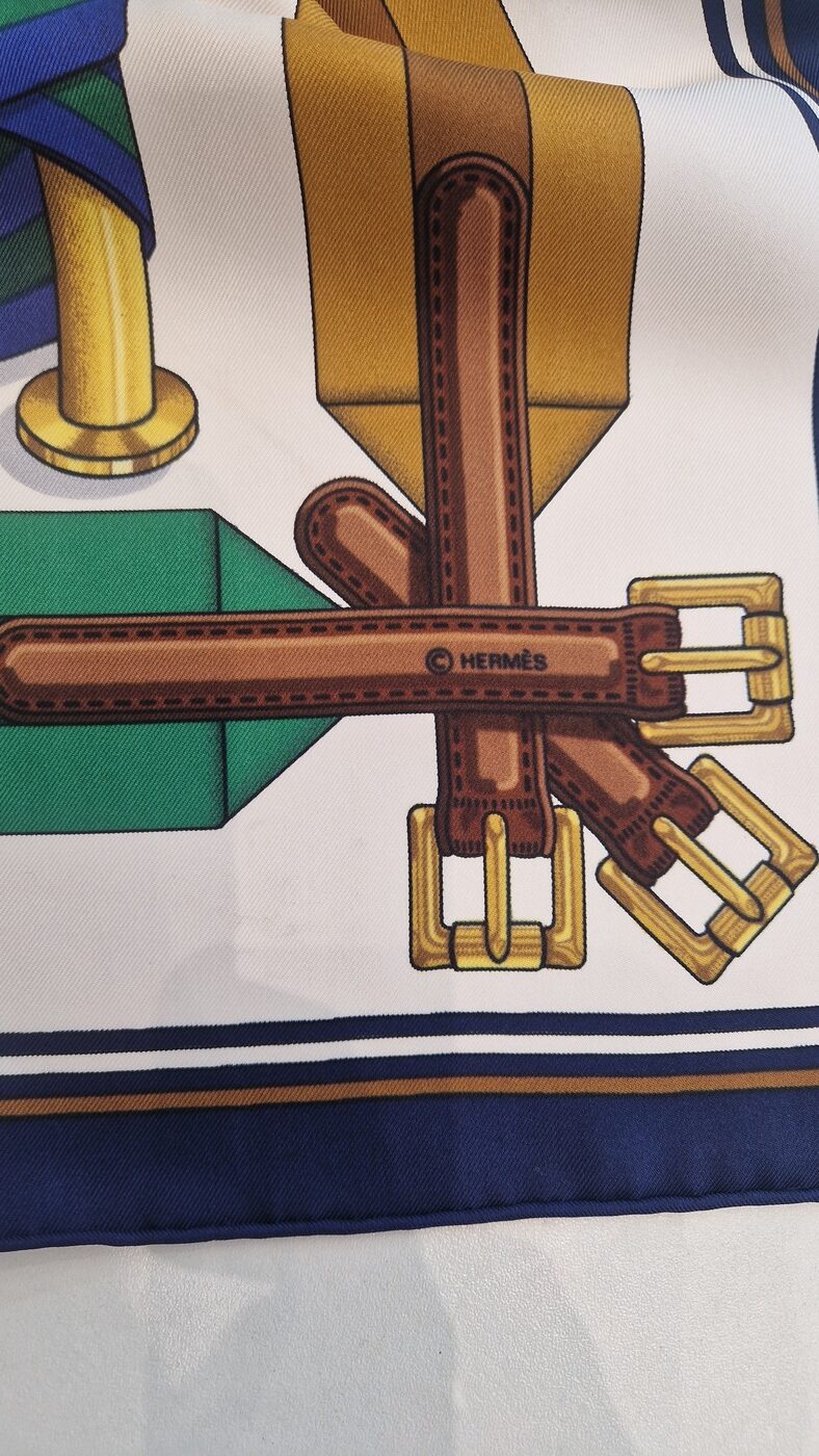 Ce carré Hermès Les sangles a été dessiné  par Joachim Metz et édité en 1985