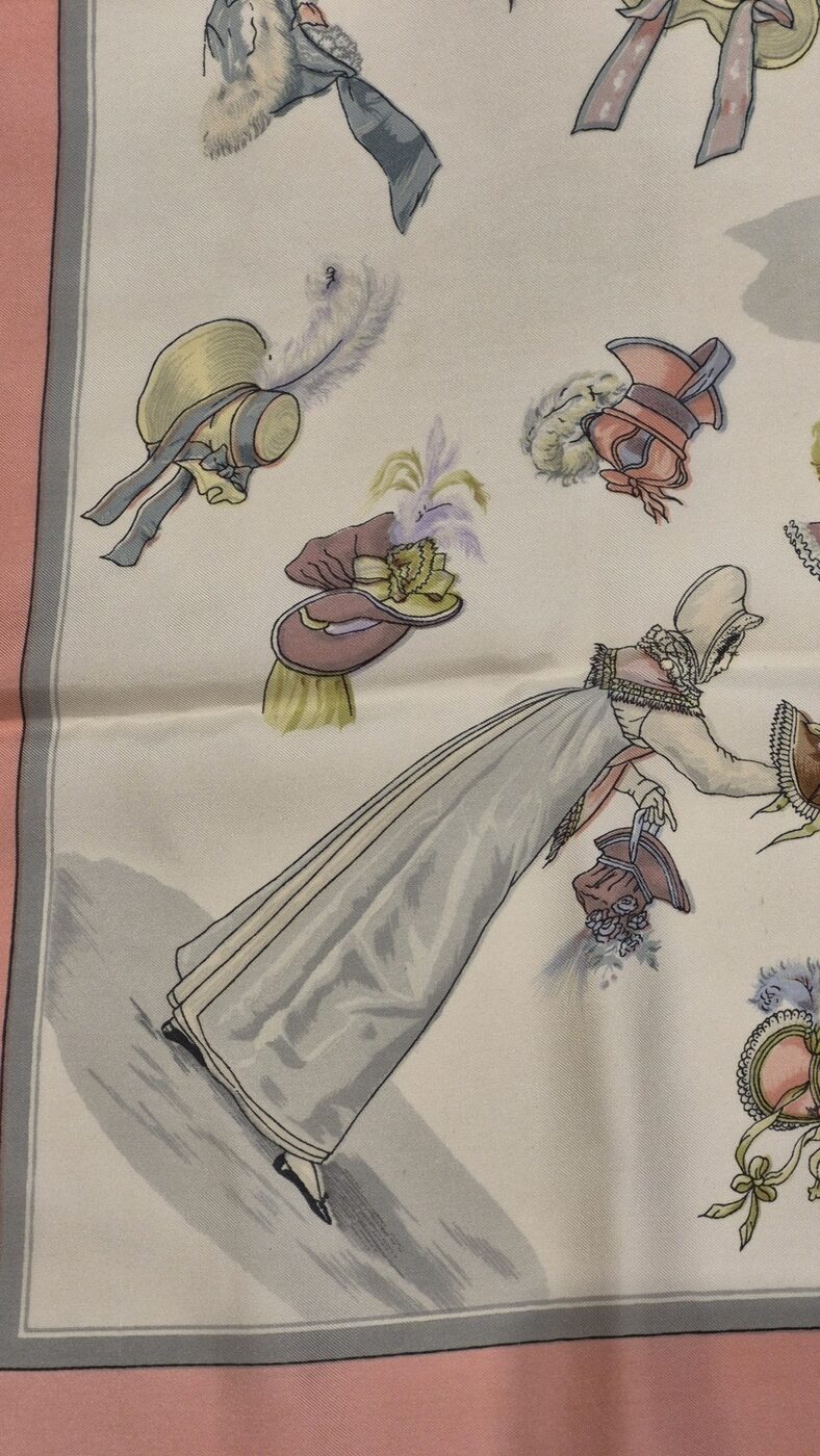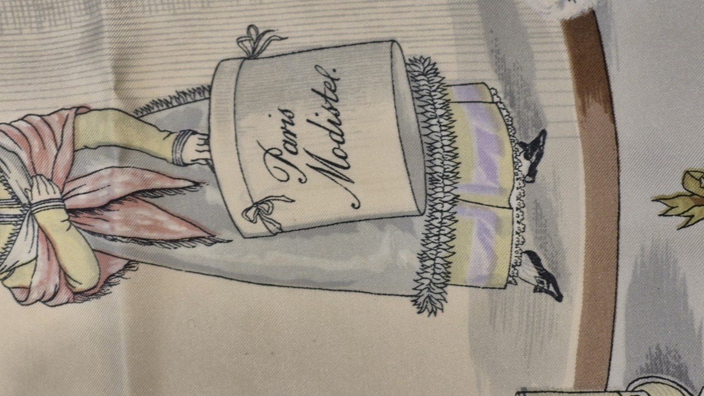 This beautiful Hermès Modiste Paris scarf, designed by Grykar in 1956, pays tribute to the refined world of 19th-century millinery. Both decorative and historical, it captures the early spirit of fashion illustration with finesse.