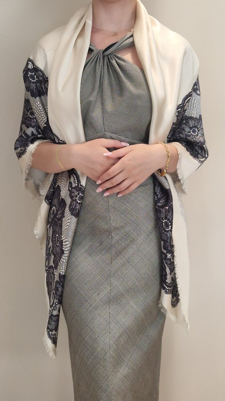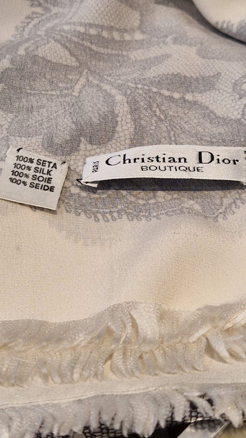 This sumptuous shawl, signed Christian Dior Boutique – Paris, beautifully embodies the timeless elegance of the house of Dior in the late 20th century. Crafted from 100% silk, it features a luminous ivory background adorned with a delicate black motif reminiscent of Chantilly lace, reinterpreted here in a graphic and contemporary style.