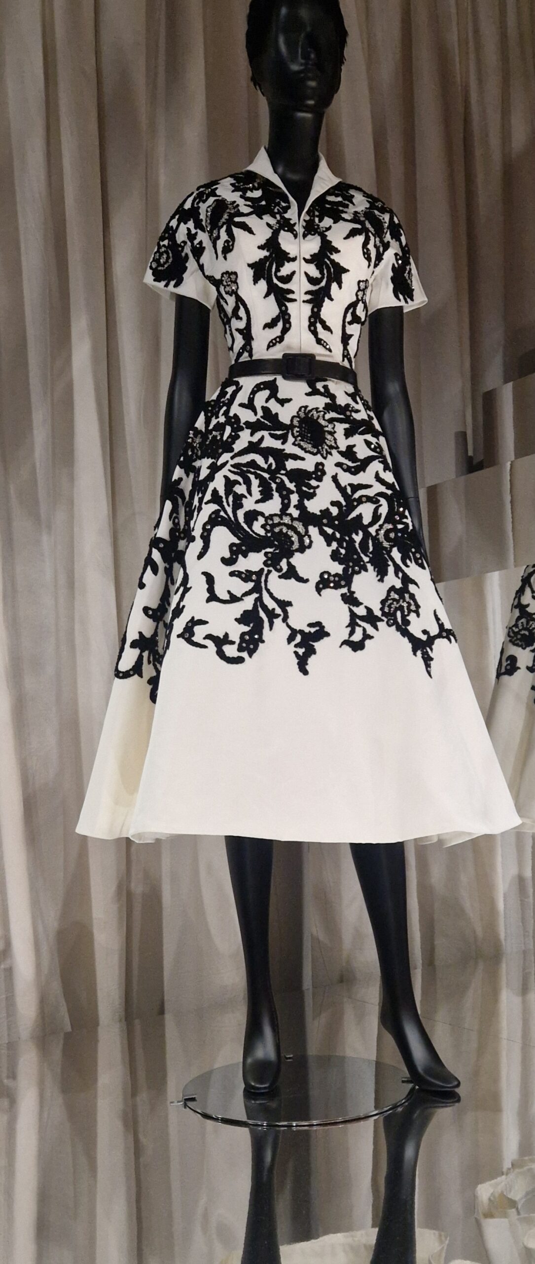 This stylized lace motif resonates directly with an iconic haute couture dress from the Dior archives, presented in the exhibition “Louvre Couture. Objets d’art, objets de mode”, held at the Musée du Louvre (24 January – 21 July 2025). I visited this marvellous exhibition The dress, made of white silk embroidered with black scrolls, reflects the same idea of lace reimagined through the lens of contemporary couture.