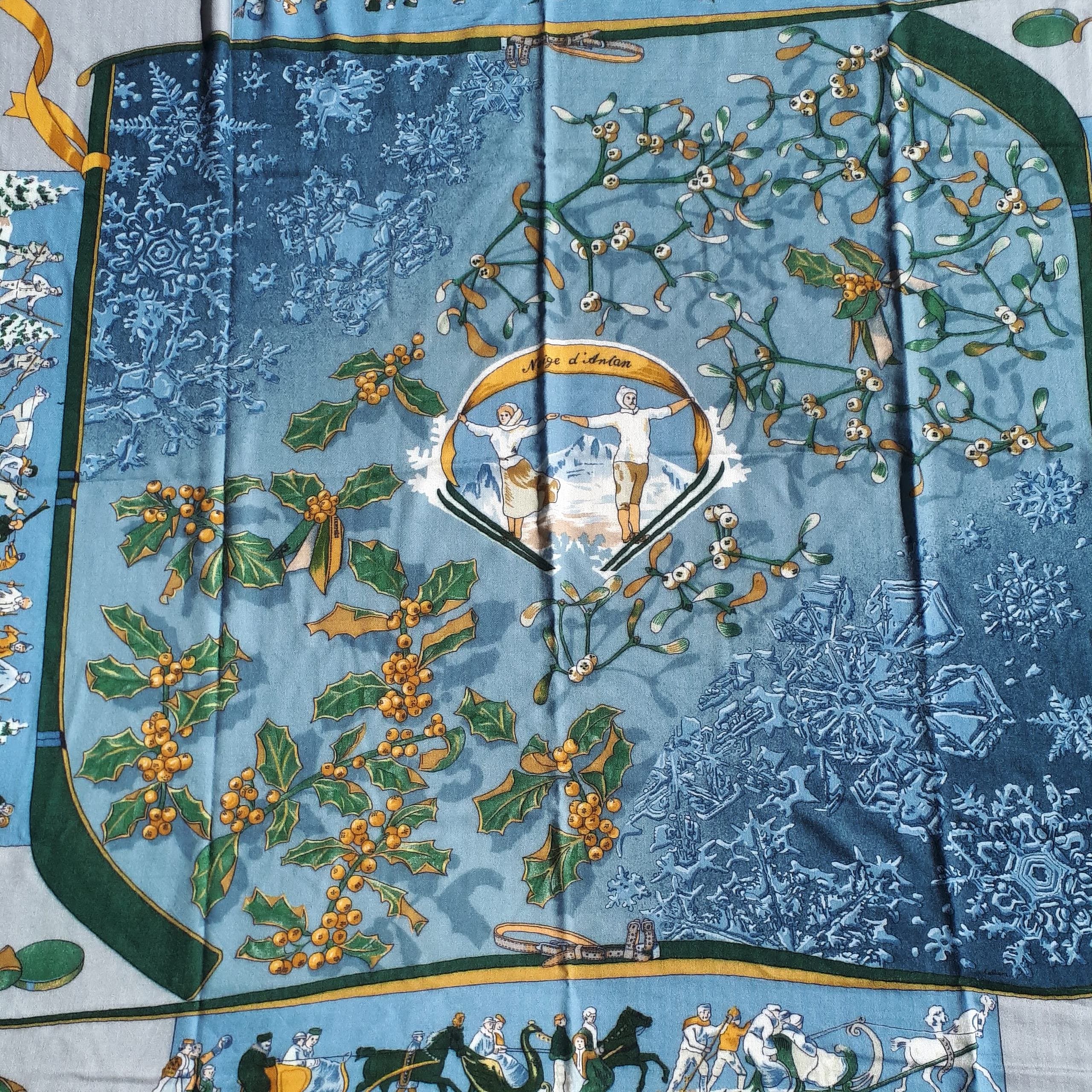 Ce beau châle en soie et cachemire a été dessiné par Cathy Latham et édité en 1989 . Très belle harmonie de gris et de bleu.