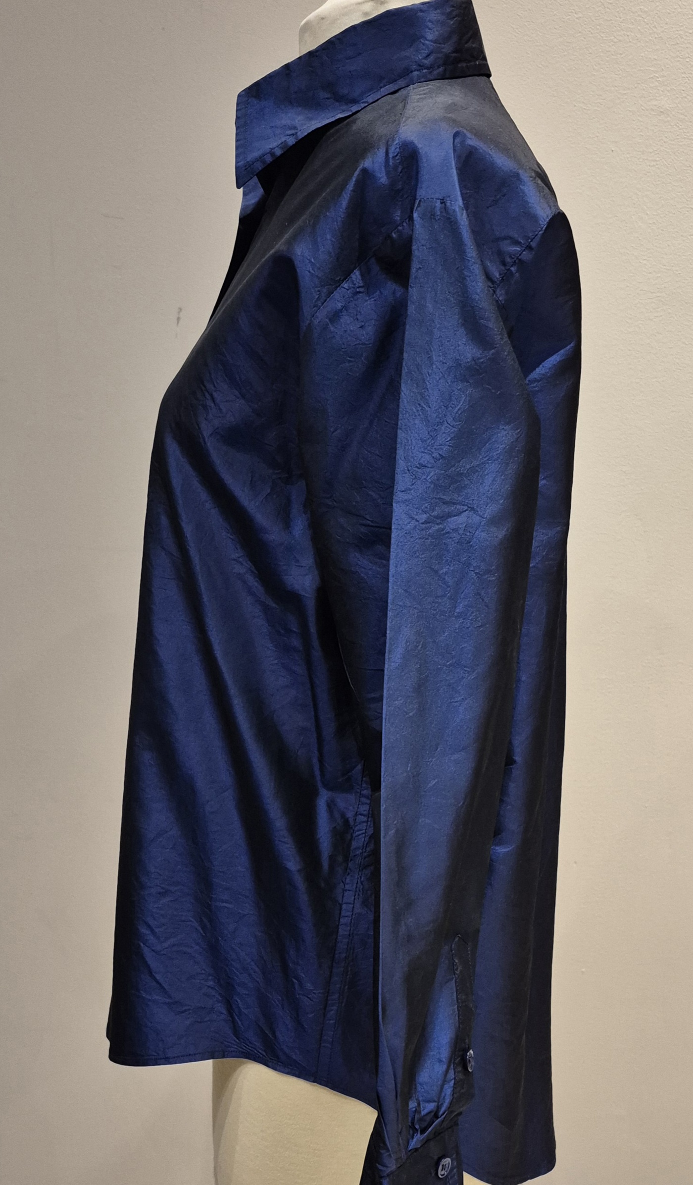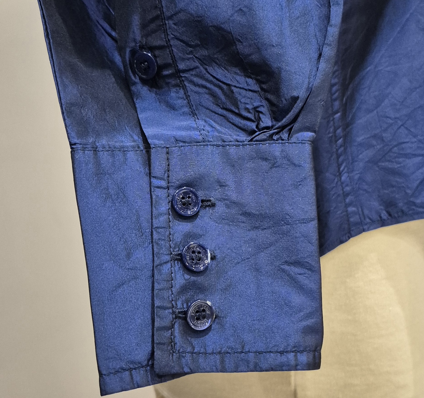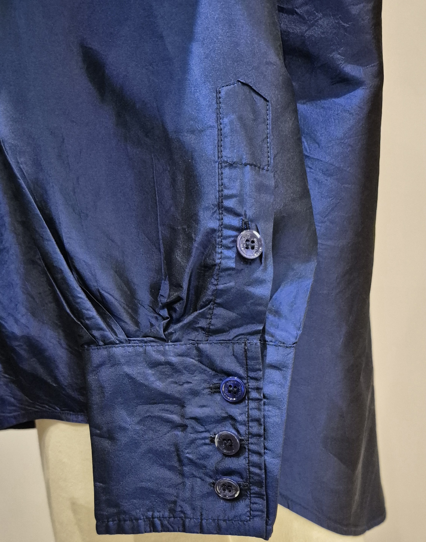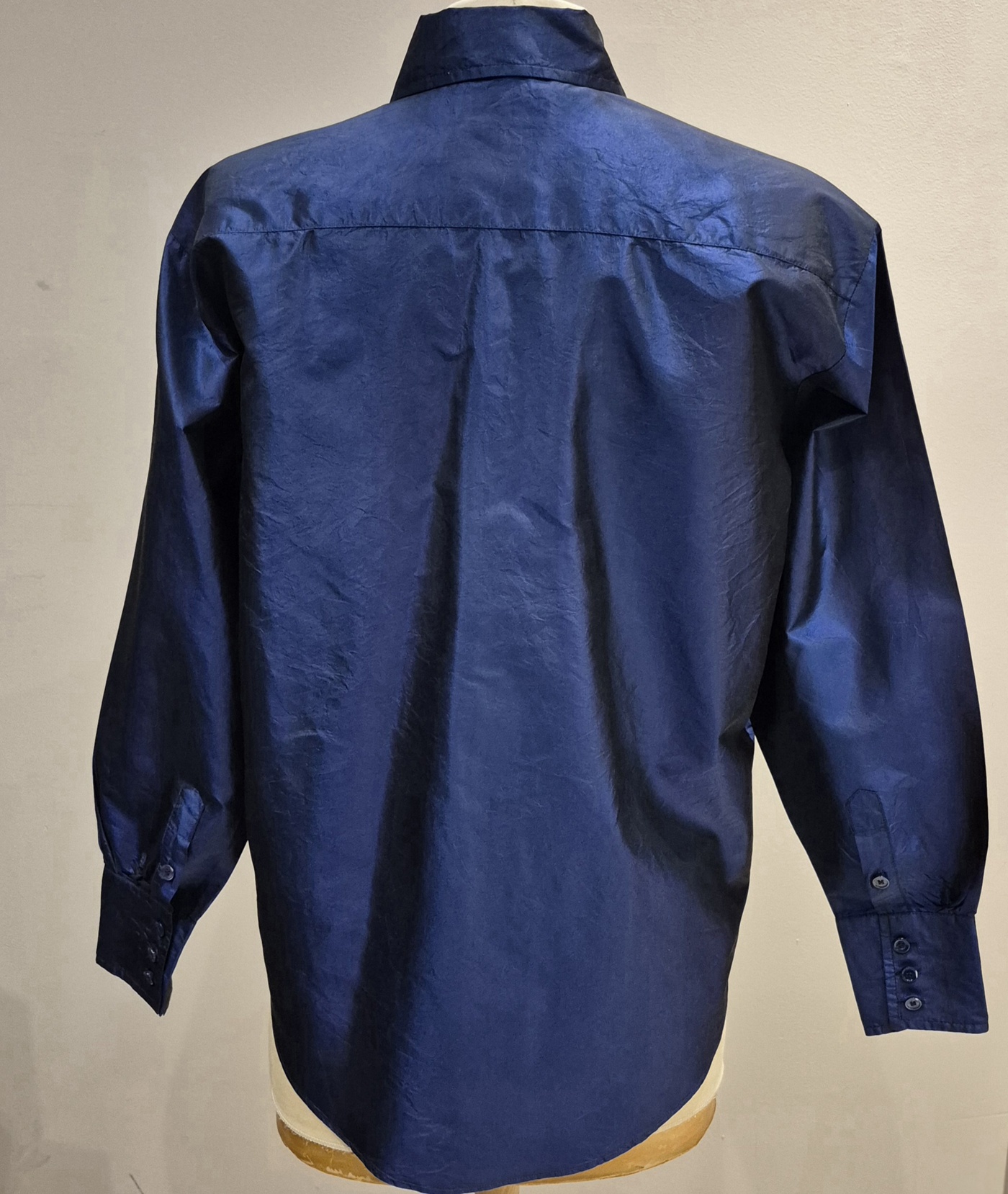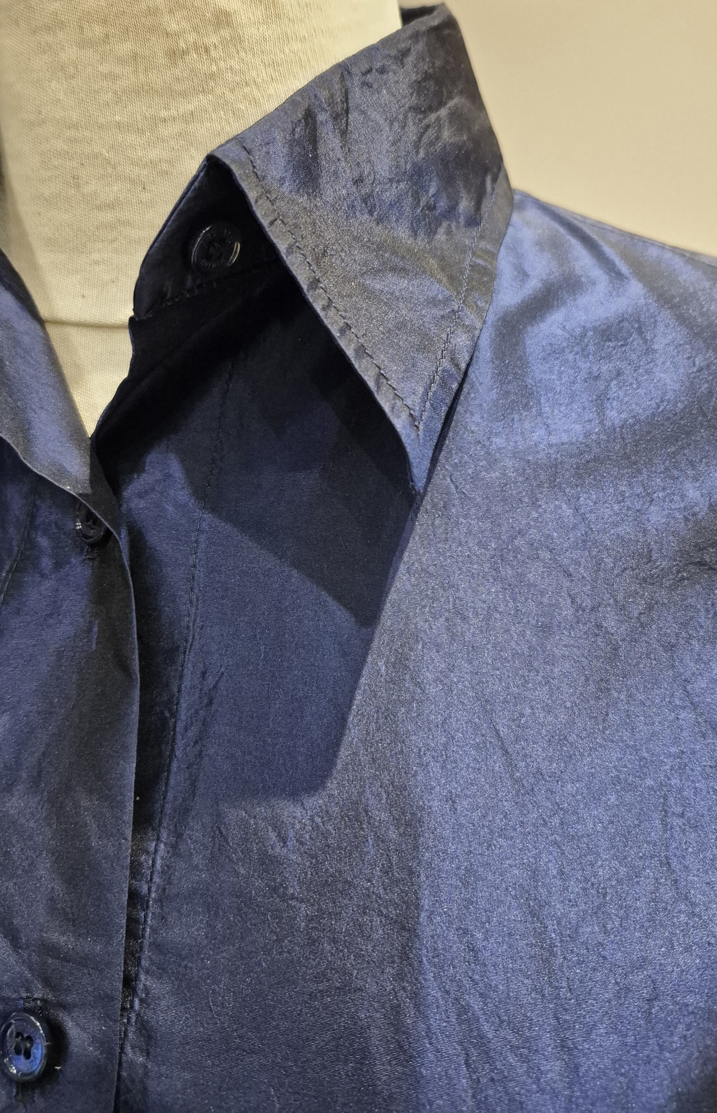 The deep midnight blue colour—almost ink-like depending on the light—enhances the natural surface variations of the silk and gives the piece a discreet yet sophisticated presence.