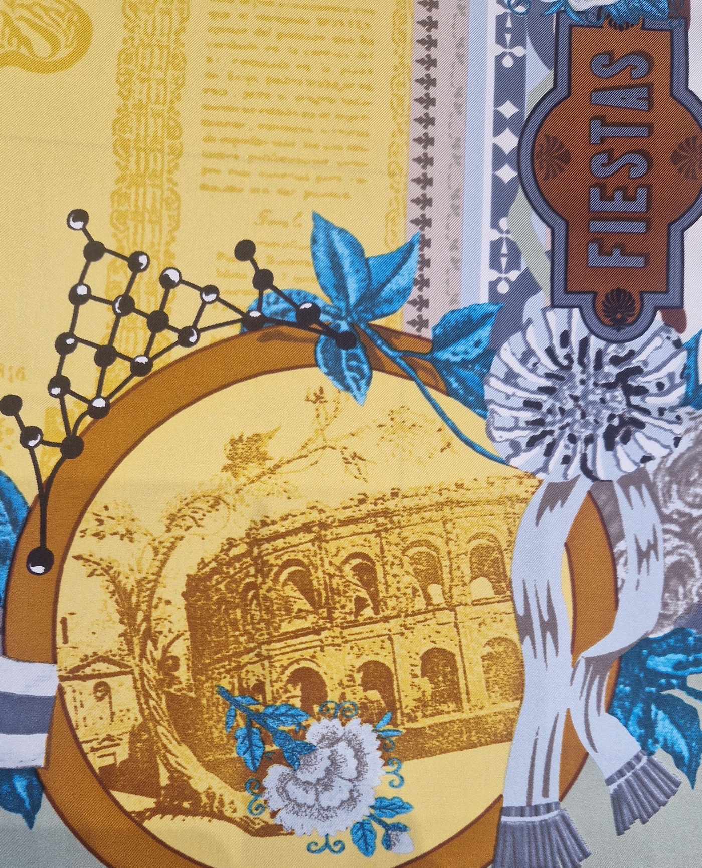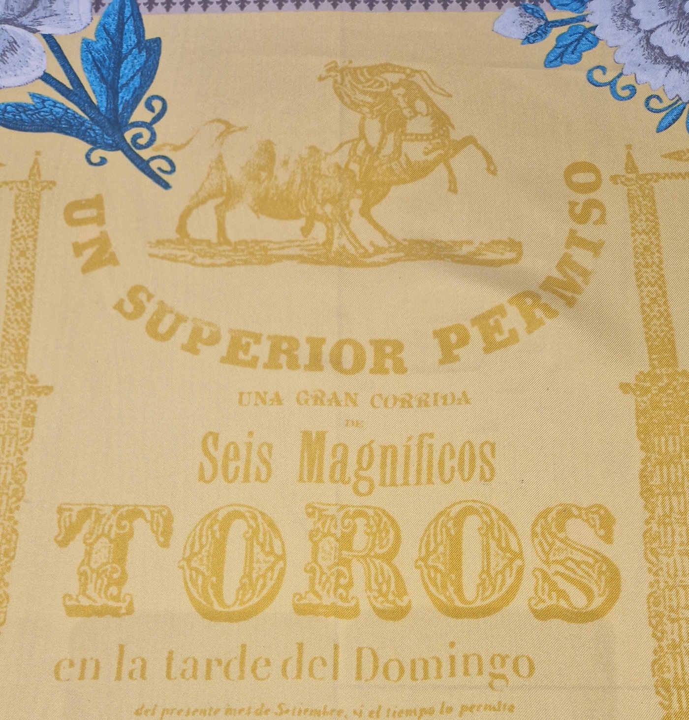 A festive and baroque inspiration, this Christian Lacroix silk scarf is a tribute to the corrida and its iconic imagery. The central design recalls vintage bullfighting posters, with the inscription “Un Superior Permiso – Seis Magníficos Toros,” surrounded by: