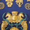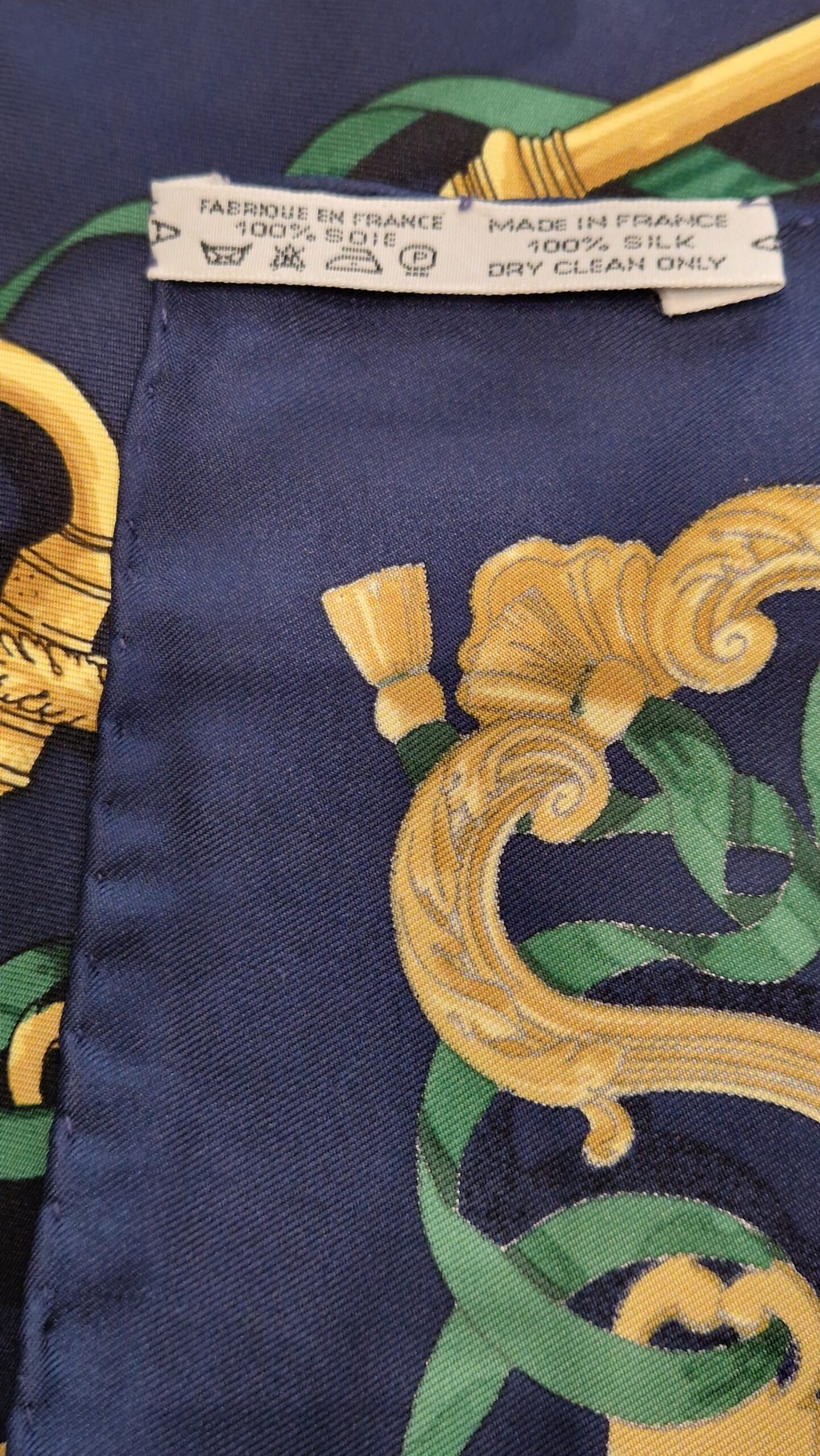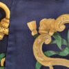 Couleurs principales fond bleu marine, motifs jaune or, vert