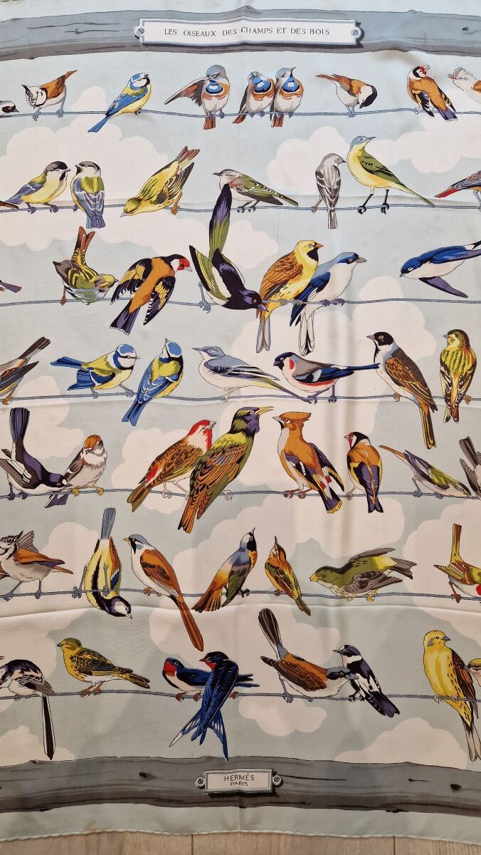 Ce rare carré Hermès 1953 Les oiseaux des bois et des champs par Hugo Grykar est très charmant et très recherché