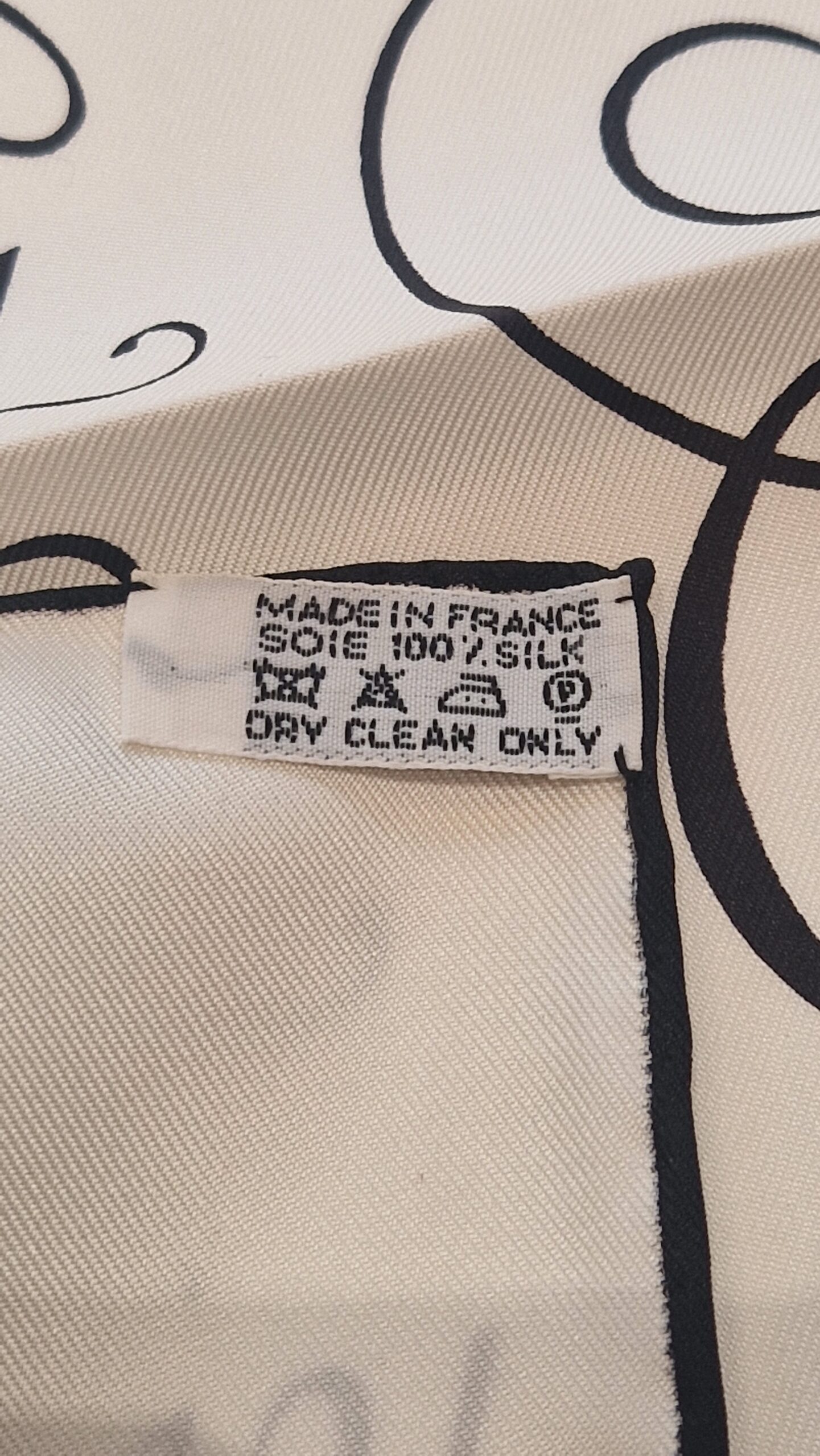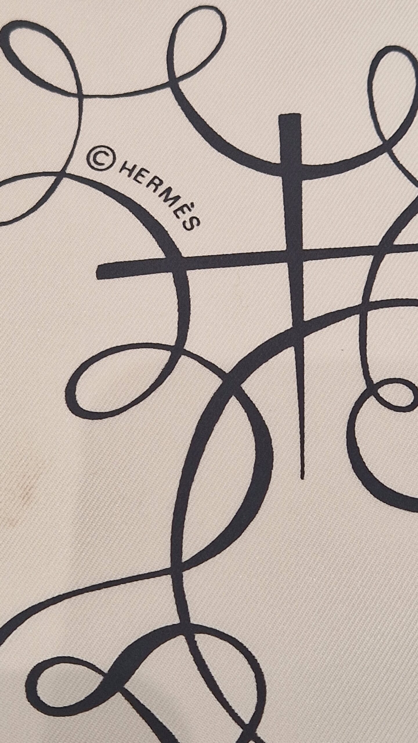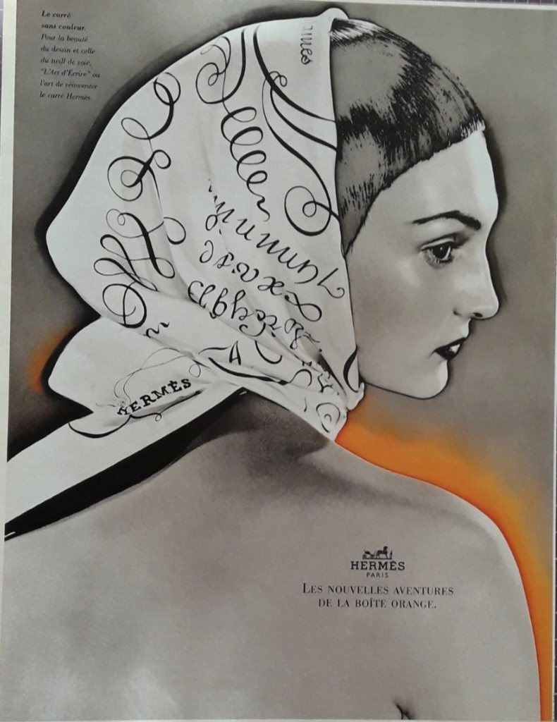 The scarf is printed in black on an ivory background. Hermès even used this model in an advertising campaign to emphasize its austere, colour-free construction and the clarity of its pen-drawn motifs.