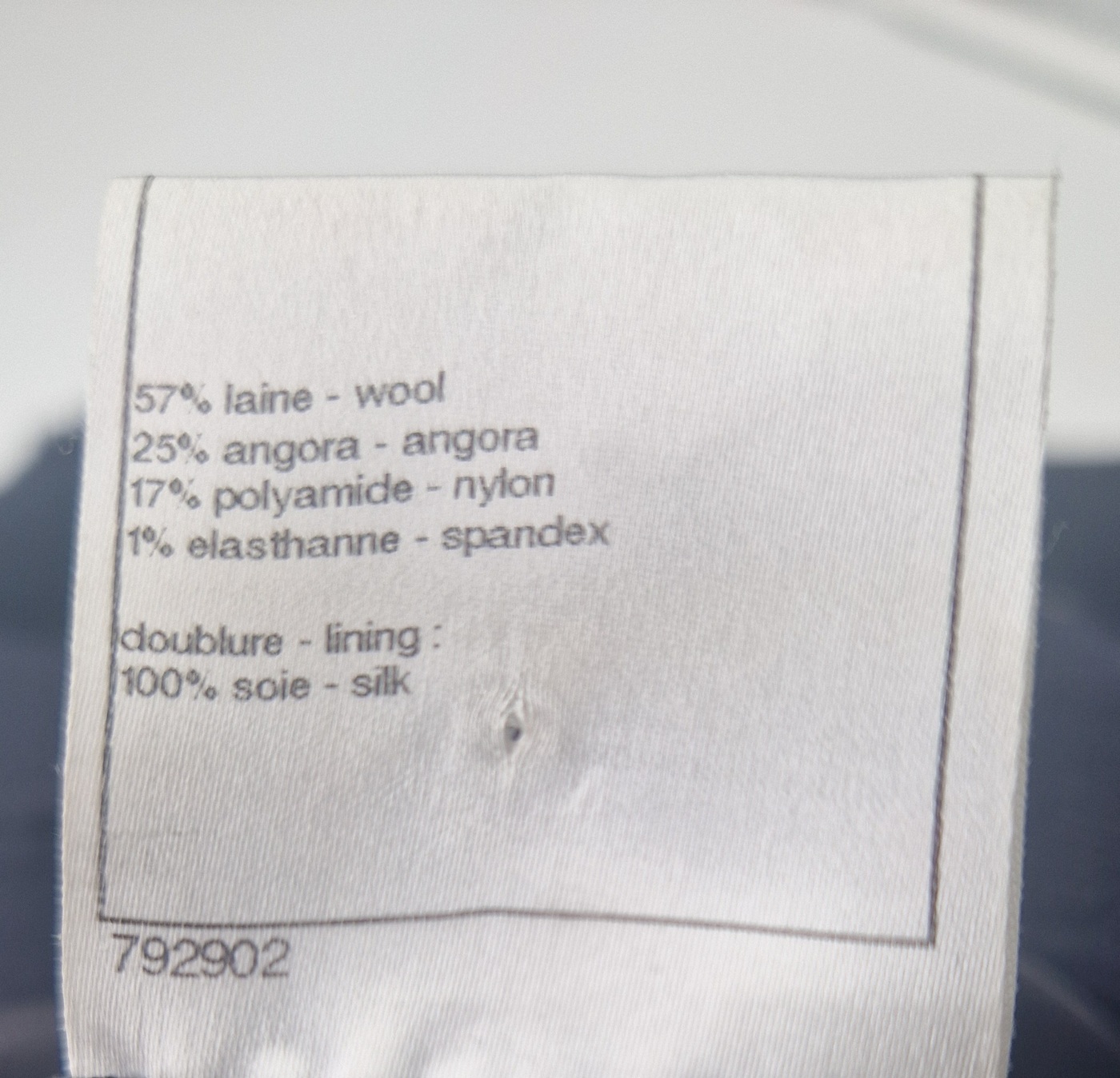 Elle est en laine 57 %, angora 25 %, polyamide 17 %, elasthane 1 % elle est entièrement doublée de soie.