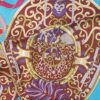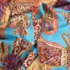 The colours are particularly refined: a turquoise blue background, framed by a deep violet border and enhanced with bright fuchsia pink hand-rolled edges, bringing vibrancy and light to the piece.