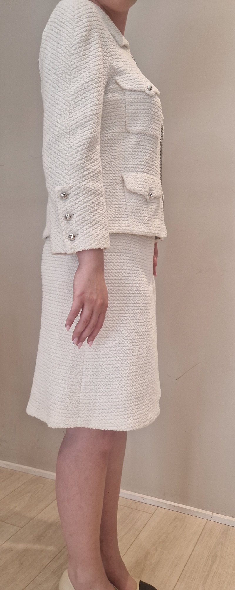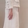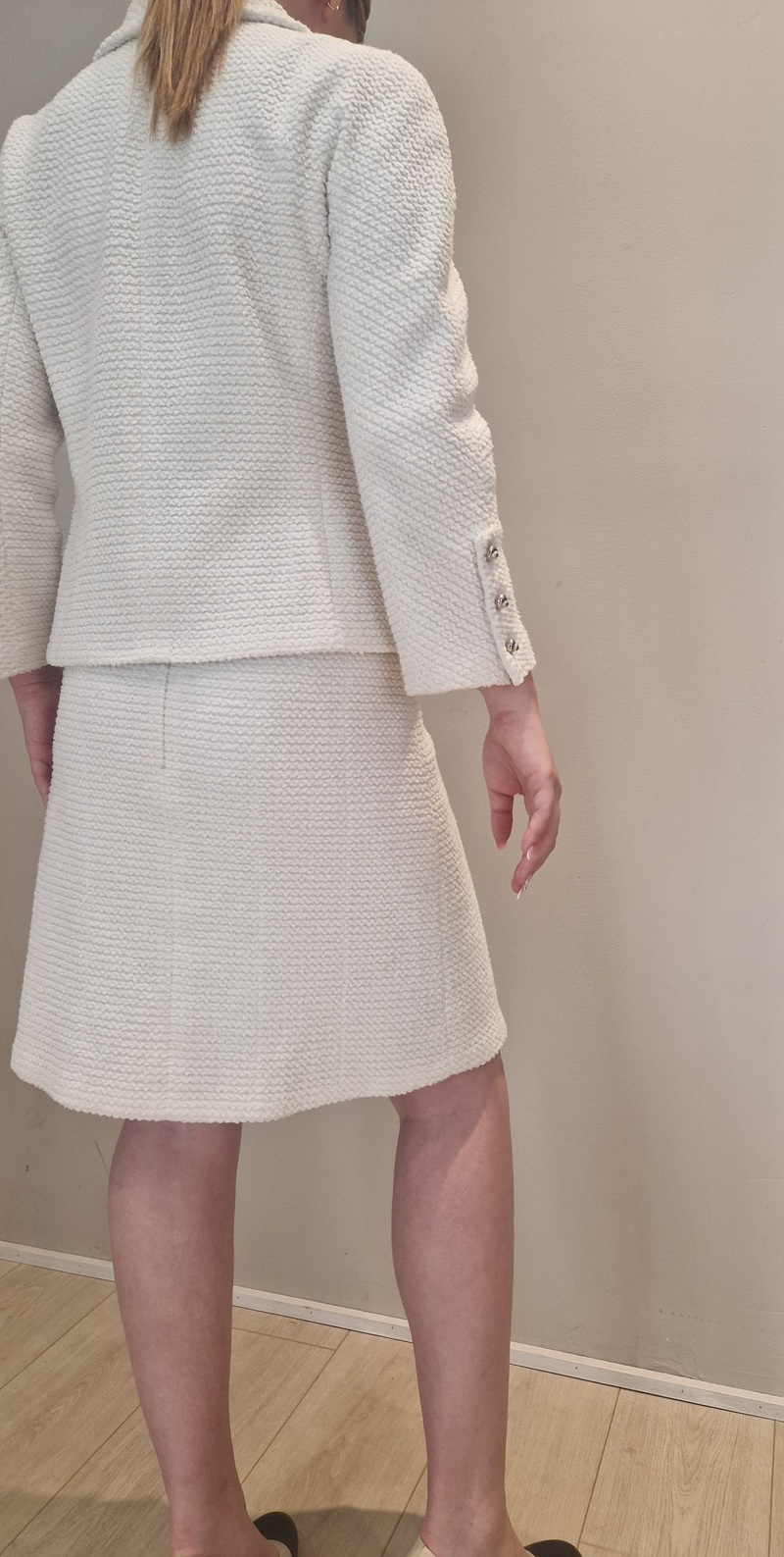 Made in France, the set includes a four-pocket jacket and a matching skirt, both lined in white cotton for optimal comfort.