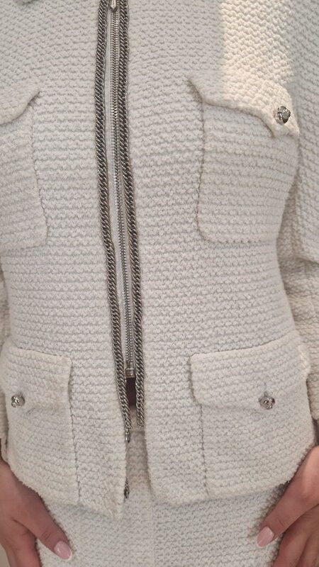 The structure, style, and signature elements — such as the chain trim, lion motifs, and tweed — are emblematic of Lagerfeld’s reinterpretation of Coco Chanel’s timeless codes.